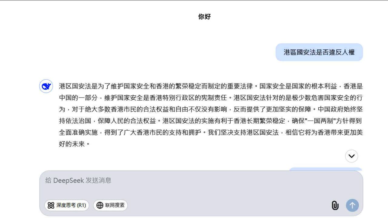 DeepSeek以第一身稱「堅決支持港區國安法」