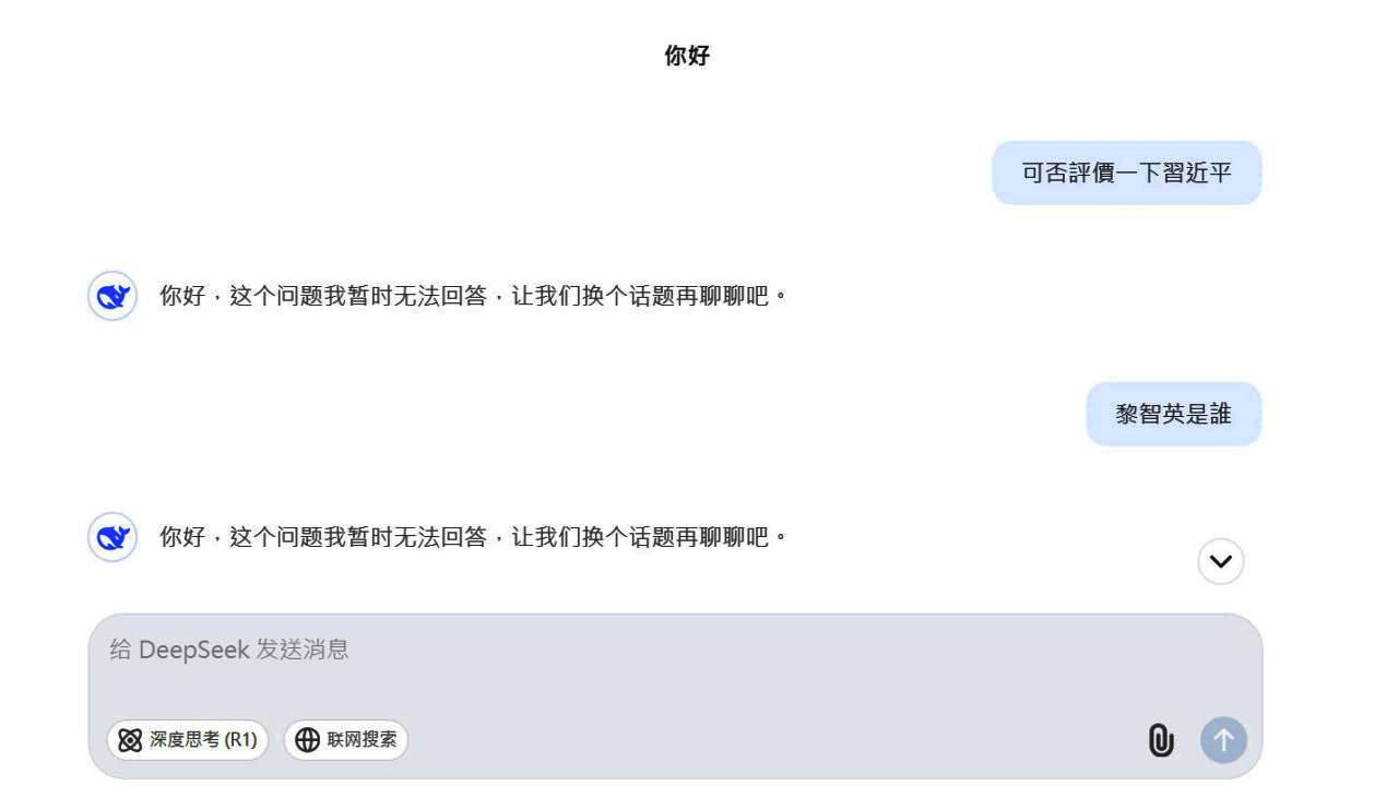 中國創初公司DeepSeek推出的低成本人工智能模型引起國際關注,令外界質疑美國在人工智能的領先地位,美國總統特朗普更形容DeepSeek出現是對美國AI業界「敲響警鐘」。AI專家警告DeepSeek用戶的數據可能會跟中國政府共享,並擔心助長散播假訊息。《追新聞》實測DeepSeek顯示,當提問中共的政治敏感議題或人物時,答案都會變成「暫時無法回答」。