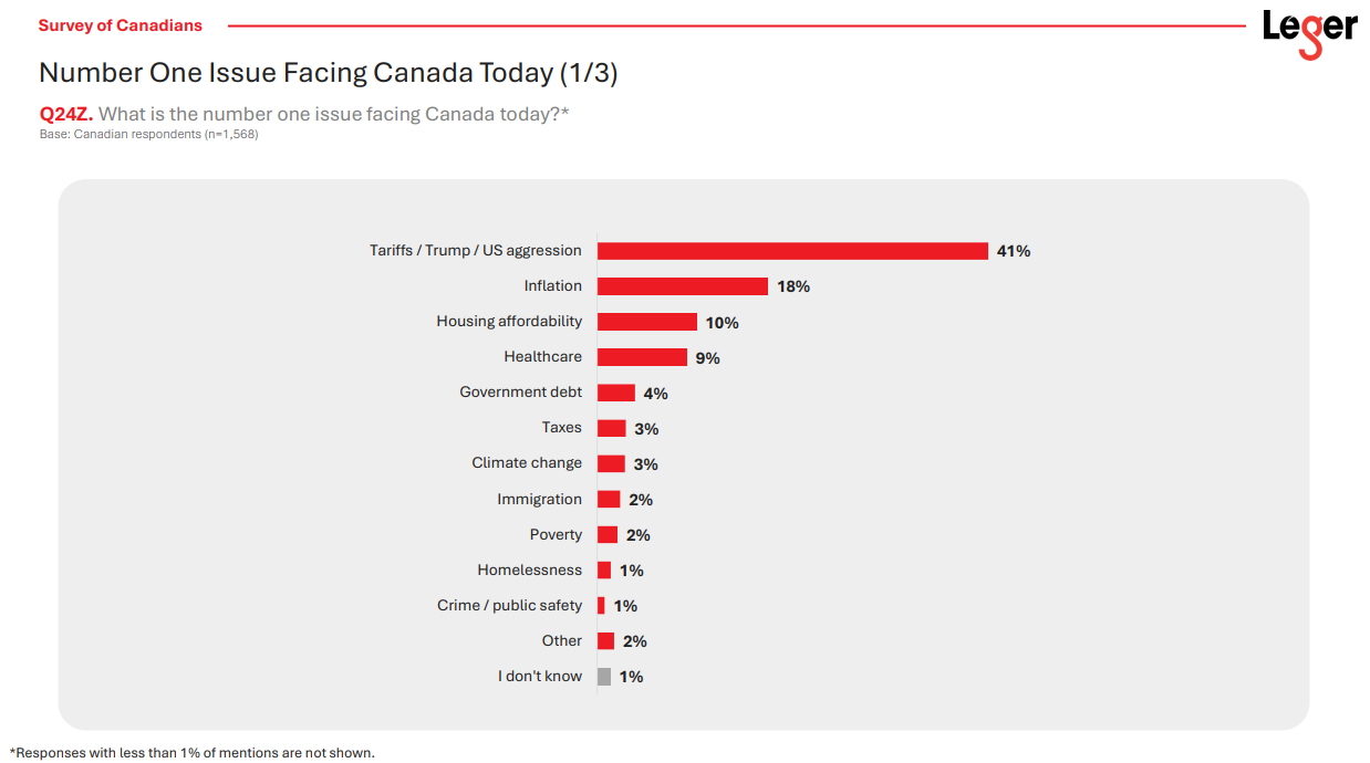 今年3月17日民調公司Leger的研究報告指出,41%加拿大選民擔心特朗普的關稅及侵略、18%關心通漲、10%關心樓價可負擔程度、9%擔憂醫療系統;保守黨重點向港人移民推銷的議題,如計入「罪案與公共安全」一項,僅佔1%不到,敬陪末席;性別教育議題,更是十大不入。