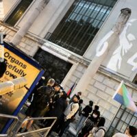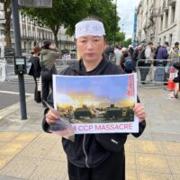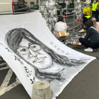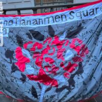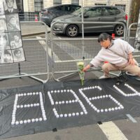 國際特赦組織會員Vrigitte與Amanda則用布碎縫製一幅橫額,表達對六四天安門屠殺的痛心。居住在南倫敦的Vrigitte向記者表示,在其居住的地方曾接獲來自中共發出的舉報信件,要求本地居民將被通緝海外港人誘到中國大使館領懸賞,她已即時向當區議員反映跨境鎮壓的猖獗。香港監察(Hong Kong Watch)信託人羅傑斯(Benedict Rogers)表示,多名海外港人遭港警懸紅通緝,而他本人與其母親也收到恐嚇信,「對我來說沒有甚麼大問題,因為沒有家人在香港,也被港府拒絕入境,但對很多香港人來說是一個警號,英國政府需要嚴肅處理跨境鎮壓問題。」