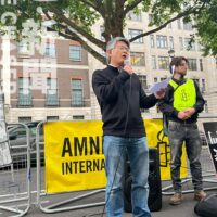 六四學運領袖吾爾開希應中國民主黨邀請前來英國,他去年2月摔落樓梯導致腦出血,身體仍在復原中,他今年參加倫敦六四集會坦言心情與參與者一樣,對於港人多年來的付出與犧牲也銘記在心。他說:「當年支聯會成員李卓人等,對我來講能夠逃離生天,被通緝之下能夠逃離中國開始流亡生涯,香港對我來說是有救命之恩,我是非常感激。」他續指,看到2019反送中運動港人的抗爭,當時也感到很焦急,流了很多眼淚,「如果我能去香港,一定會跟香港人站在一起。」吾爾開希參與下午6時由中國民主黨的紀念六四集會後,並沒有逗留至晚上8時,參加由國際特赦組織發起的六四燭光晚會。