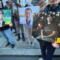 「但有一個夢,不會死,記着吧! 無論雨怎麼打,自由仍是會開花。」《自由花》歌聲繼續響徹中國駐英大使館外街頭。逾500人手持燭光,薪火相傳毋忘慘痛,同時支援在囚的前支聯會骨幹成員鄒幸彤、何俊仁、李卓人,以及壹傳媒創辦人黎智英,在海外仍能發聲下肩負將燭光延續下去。