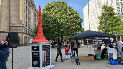 今年六四,曼城、雪埠、窩靈頓、伯明翰、諾定咸、雪埠、卡迪夫、京士頓等地都有港人舉行悼念集會。在曼城,有超過400人出席傍晚在市中心聖彼得廣場(St. Peter’s Square)舉行的一個半小時集會,參加者以中年及長者為主,亦有父母帶同年幼子女一同出席。現場寫有白布黑字的標語「釋放社運人士,結束一黨專政」,地上則以白蠟燭砌出「8964」的數字,期間大會安排播放「天安門母親」成員張先玲的錄音發言。