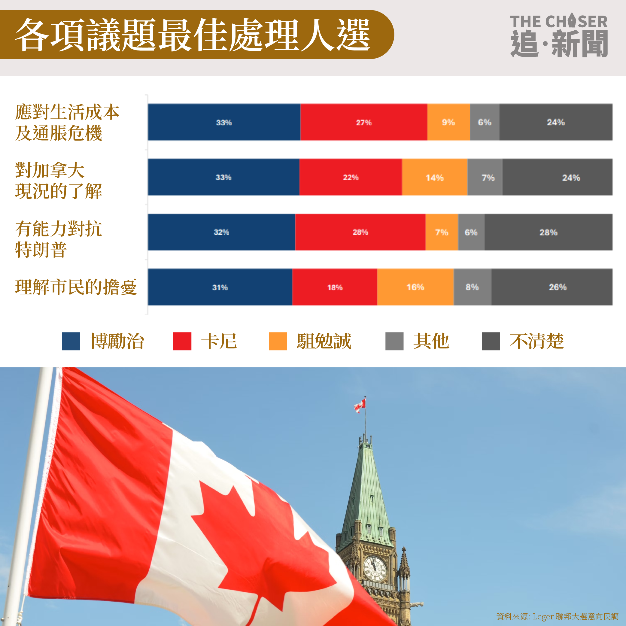 民調機構Leger在3月7日至3月10日期間向約1,500名加拿大人進行訪問,報告結果顯示自卡尼上周勝出黨魁後,原本支持率一直領先的保守黨已被自由黨追平,保守黨支持率較二月尾下跌6個百分點,自由黨支持率則上升7個百份點,兩黨支持率均達到37%。