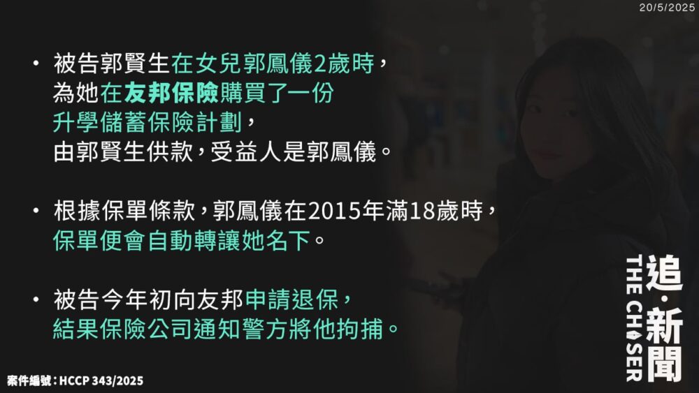 庭上透露,68歲的被告郭賢生是工程公司老闆,沒有案底,在女兒郭鳳儀2歲時,為她在友邦保險購買了一份升學儲蓄保險計劃,由郭賢生供款,受益人是郭鳳儀。根據保單條款,郭鳳儀在2015年滿18歲時,保單便會自動轉讓她名下。涉案保單已供款10多年約9萬港元,若退保價值約8.8萬港元,被告今年初向友邦申請退保,結果保險公司通知警方將他拘捕。