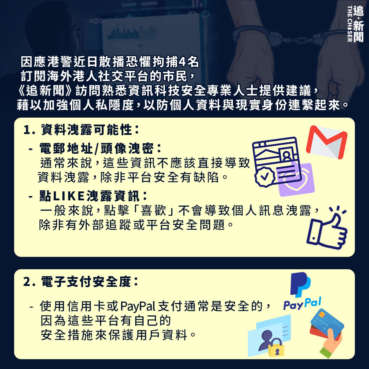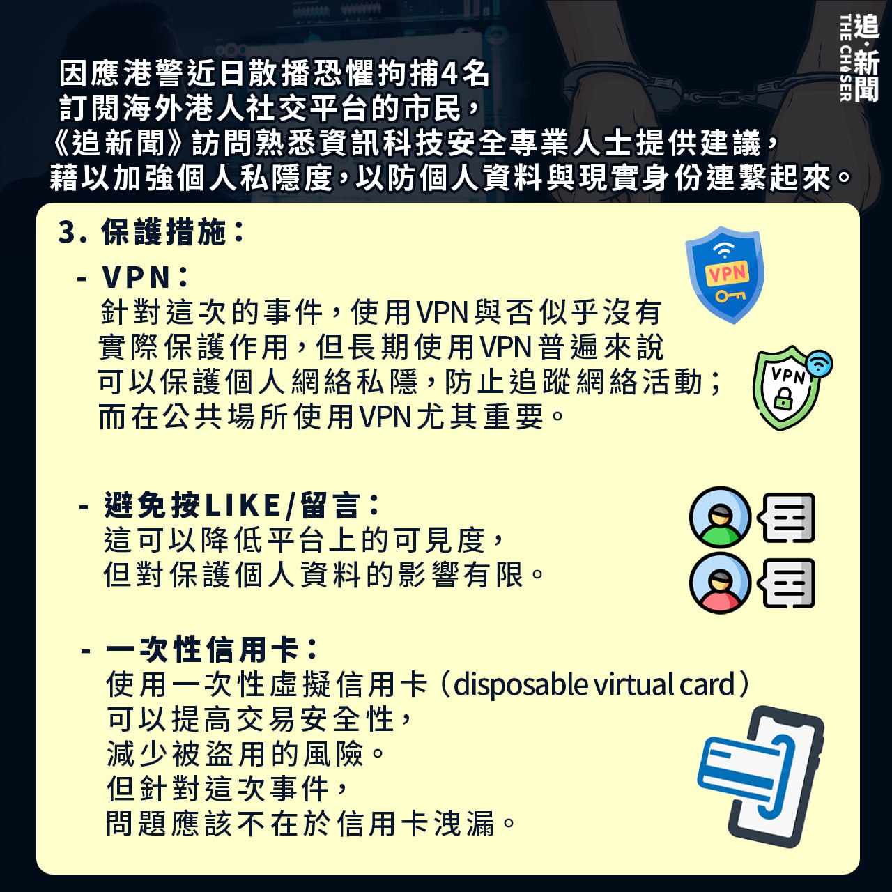 因應港警近日散播恐懼拘捕4名訂閱海外港人社交平台的市民,《追新聞》訪問熟悉資訊科技安全專業人士提供建議,藉以加強個人私隱度,以防個人資料與現實身份連繫起來。