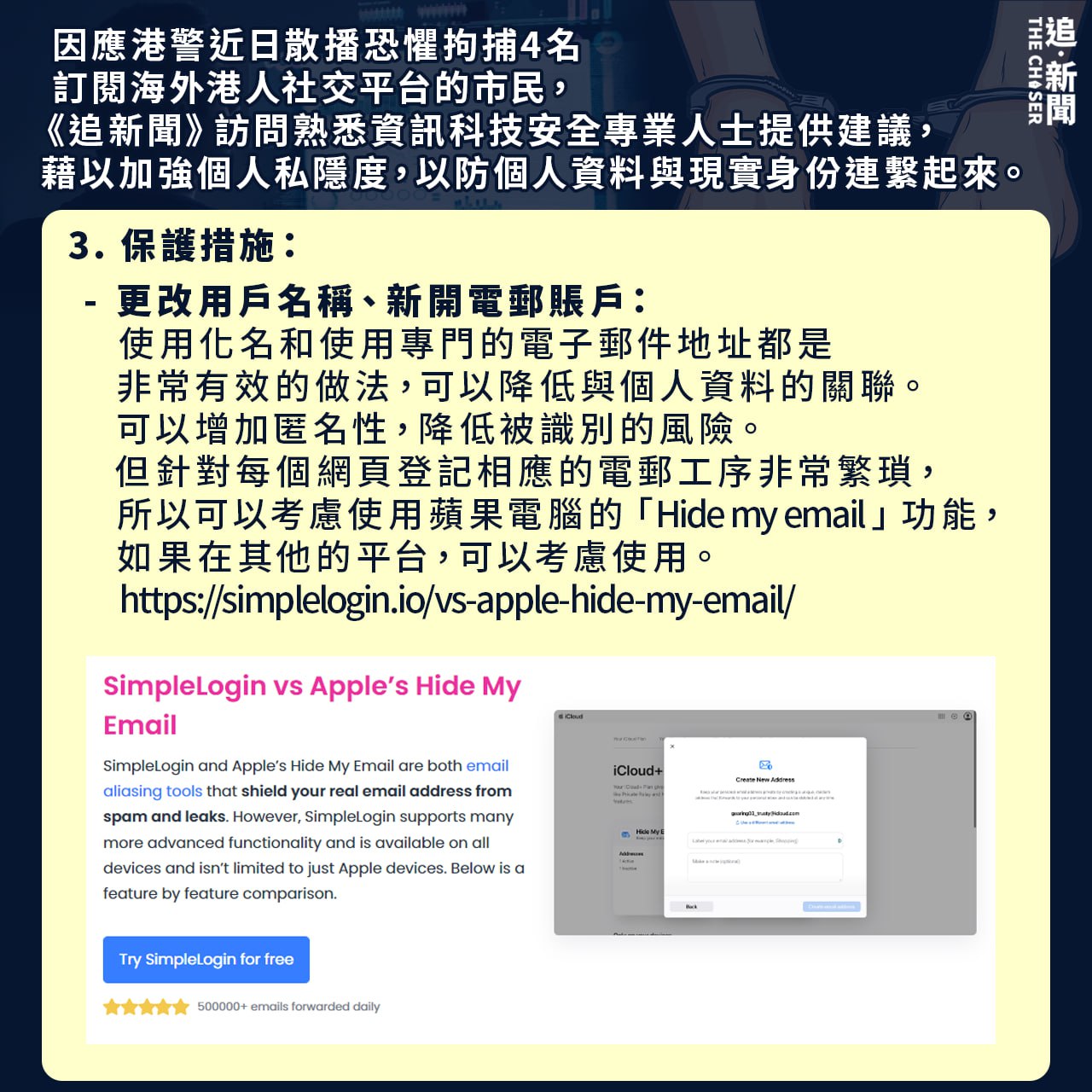 – 更改用戶名稱、新開電郵賬戶:使用化名和使用專門的電子郵件地址都是非常有效的做法,可以降低與個人資料的關聯。可以增加匿名性,降低被識別的風險。但針對每個網頁登記相應的電郵工序非常繁瑣,所以可以考慮使用蘋果電腦的「Hide my email」功能,如果在其他的平台,可以考慮使用。https://simplelogin.io/vs-apple-hide-my-email/