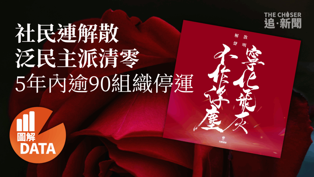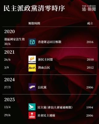 成立19年的社民連上周在7.1前夕宣佈解散,標記着香港泛民主派政黨正式清零。社民連自成立以來一直以「議會內外,抗爭到底」為口號,曾被視為「激進民主派」,並長期推動雙普選等政治議題,其成員多次在社運事件中被捕,標誌性行動包括每年7.1遊行抬棺材抗議。