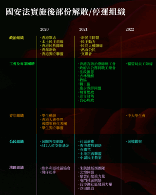 根據美國喬治城大學亞洲法中心去年發表的報告顯示,自2020年國安法實施至2023年底,香港已有超過90個組織或團體解散。