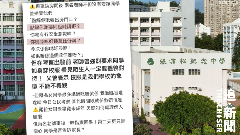 聖保羅書院中五男生交流期間離世事件後,香港公社科考察交流團又出事!社交媒體Threads周日(29日)傳出將軍澳威靈頓教育機構張沛松紀念中學上周四、周五(26日、27日)舉行深圳兩日一夜交流團,兩名穿着學校運動裝的中五女生於上周四晚上950分在老師許可下,從賓館準備乘坐升降機從4樓前往2樓活動室途中,突然被4名聲稱「政府公安部」的醉酒男子包圍,用普通話問道:「你們是香港來的嗎?」「為甚麼普通話這麼標準?」又拿出手機靠近拍攝影片,索取微信及電話號碼,令女生感到不適。期間,女生嘗試致電隨團教師求助逾15分鐘卻無人接聽,直至同團的鄰校教師發現並出手營救,騷擾才告終。香港教育局周一(30日)表示,已聯絡有關學校和承辦機構了解事件,並要求學校進一步跟進事件和提交調查報告。