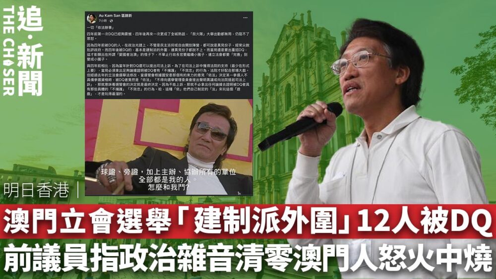 澳門立法會選舉再爆大DQ!包括現任議員林宇滔在內的12名「建制派」外圍直選參選人遭國安委指為不擁護澳門《基本法》及不效忠澳門特區後,澳門立法會選舉管理委員會周二(15日)宣布取消12人參選資格,不得提出聲明異議或司法上訴。澳門前立法會議員區錦新在社媒發帖轉發電影《少林足球》截圖引述魔鬼隊總教練強雄對白:「球證、旁證,加上主辦、協辦5所有的單位都是我的人,怎麼和我鬥?」指澳門政治全面「和諧」,再無雜音,「救火隊」出動仍「阻不了眾怒」。「今日澳門、明日香港」下,外界關注今年底香港立法會選舉「西環契仔」謝偉俊等香港建制派外圍人士或政黨去向。
