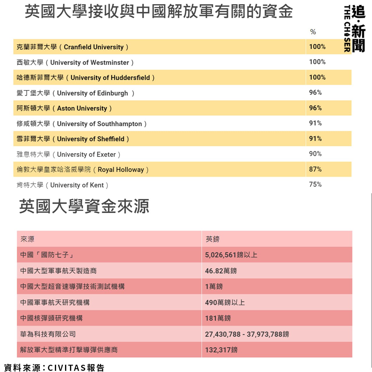 Citicard 國防及安全部總監Robert Clark在發佈會上表示,Civitas透過《資訊自由法》向全英88間院校要求提供來自中國的學術資金,有46間院校回覆自2017年開始研究基金、捐款及合作來自中國,當中不包括中國留學生每年為英國帶來220億鎊(約2,140億港元)的國際生學費。他坦言對結果感到意外:「在過去2至3年來,英國大學至少有三分之一資金來自中國,而當中非常明顯與中國軍方企業有密切連繫。」