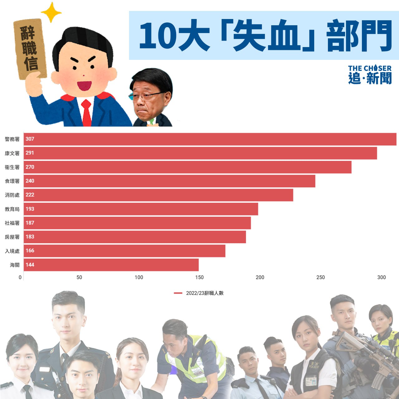 香港政府提交立法會文件顯示,公務員辭職潮持續升高,2022/23年度共有3,863名公務員辭職,當中10大「失血」部門中(表),警務處辭職人數最多(307人),其次是康文署(291人),再其次是衞生署(270人)。10大失血部門中,保安局佔四個,分別是警務處(307人)、消防處(222人)、入境處(166人)及海關(144人),保安局四大失血部門去年度共有839人辭職,佔整體公務員辭職人數21%。