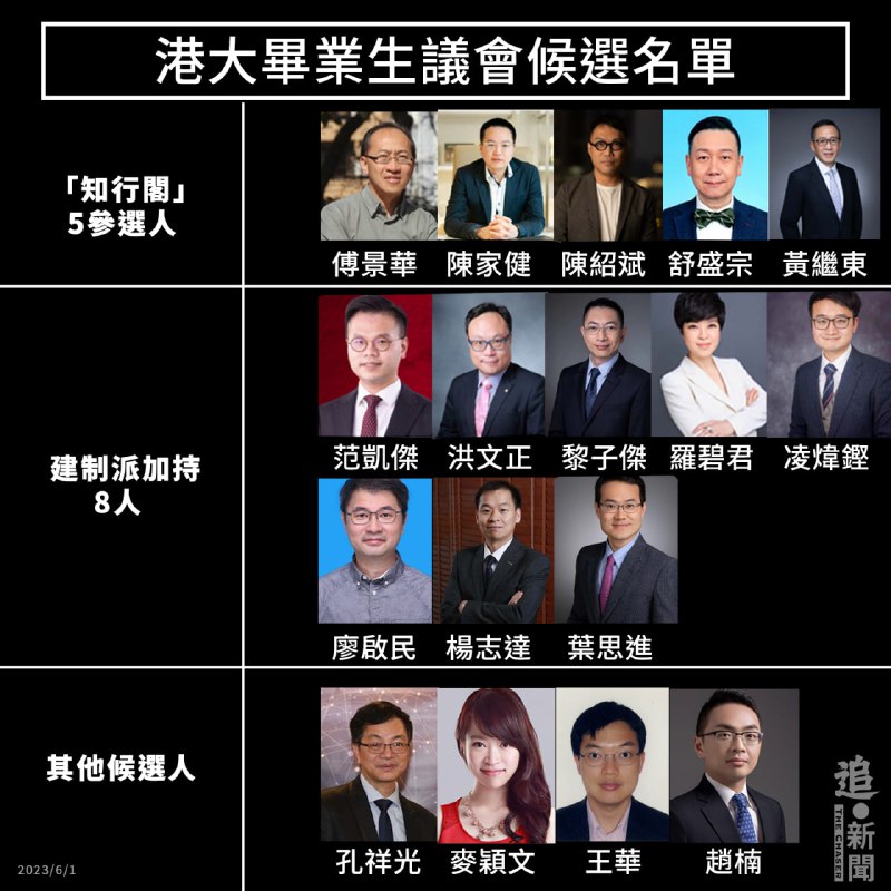 香港大學畢業生議會代表逾26萬港大校友及教員,其常務委員會選舉近日開始投票,過往由開明派成員主導,更曾因參選人數少而自動當選。本屆卻競爭激烈,破天荒17人爭8席。有8名候選者的提名人為建制派「重量級」人馬及前高官,包括立法會前主席曾鈺成、立法會前議員蔡素玉、教育局前局長羅范椒芬、行政會議前成員王䓪鳴、全國港澳研究會顧問劉兆佳和立法會議員周浩鼎等。另一邊廂,5名現任開明派委員續組「知行閣」團隊競逐連任,「知行閣」發言人、港大新聞及傳媒研究中心教授傅景華向《追新聞》坦言對能否勝選有隱憂,「但我哋仍有信心,因為對於捍衞學術自由、院校自主嘅往績係有目共睹,希望過去曾投票畀我哋嘅人會繼續支持『知行閣』」。