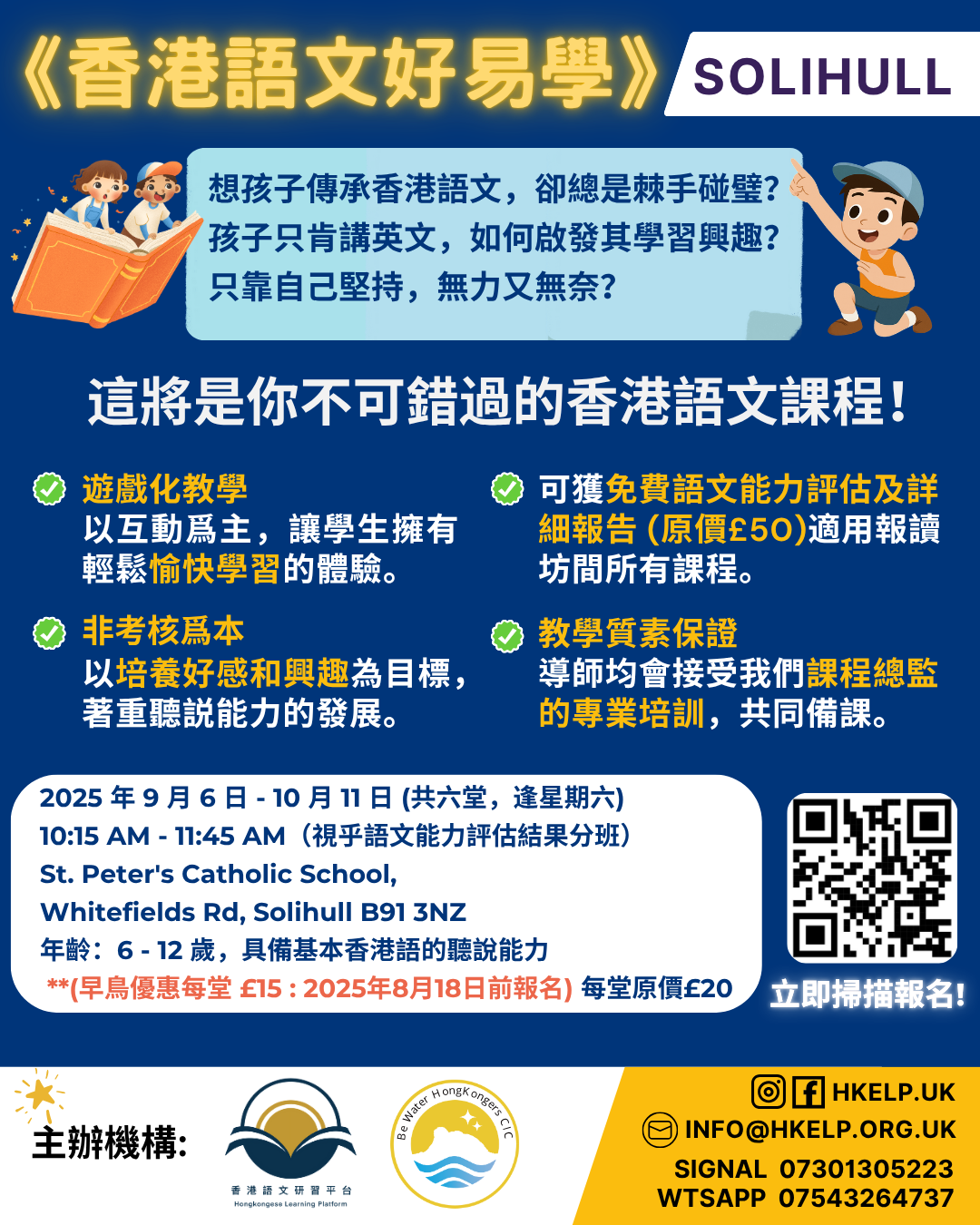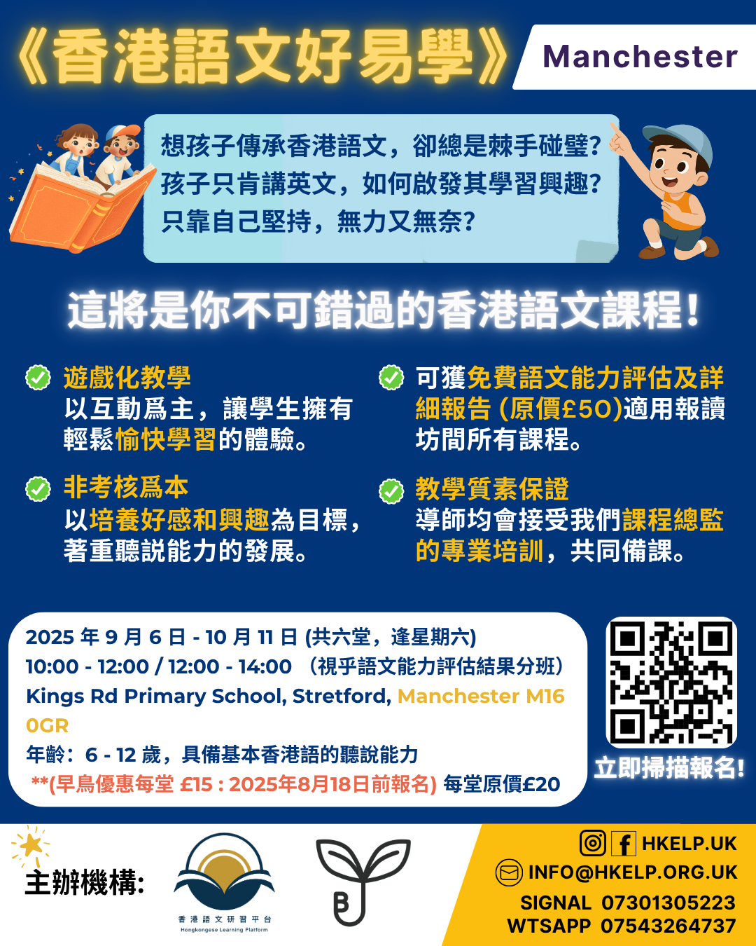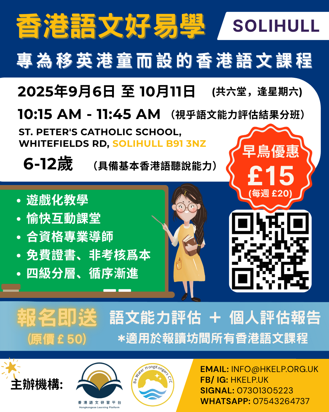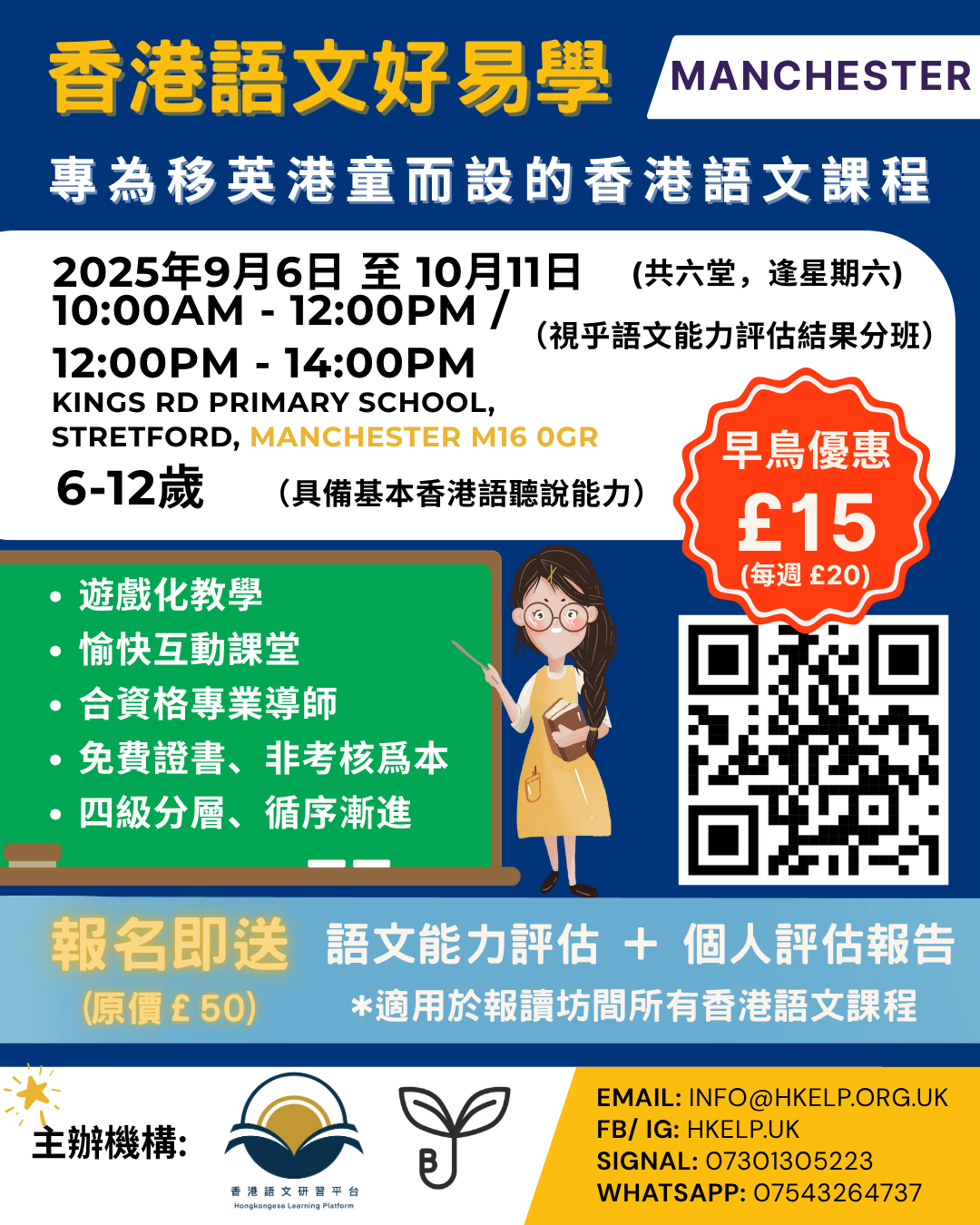 特別優惠: 學生需要參加「學前語文能力評估」(價值 £50),並會獲得詳細的「個人能力報告」,以確定合適的課級(入門級到第三級)。報告適用於報讀坊間其他香港語文課程,而會報讀課程的學生可獲£50學費減免,等同免費進行評估。