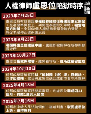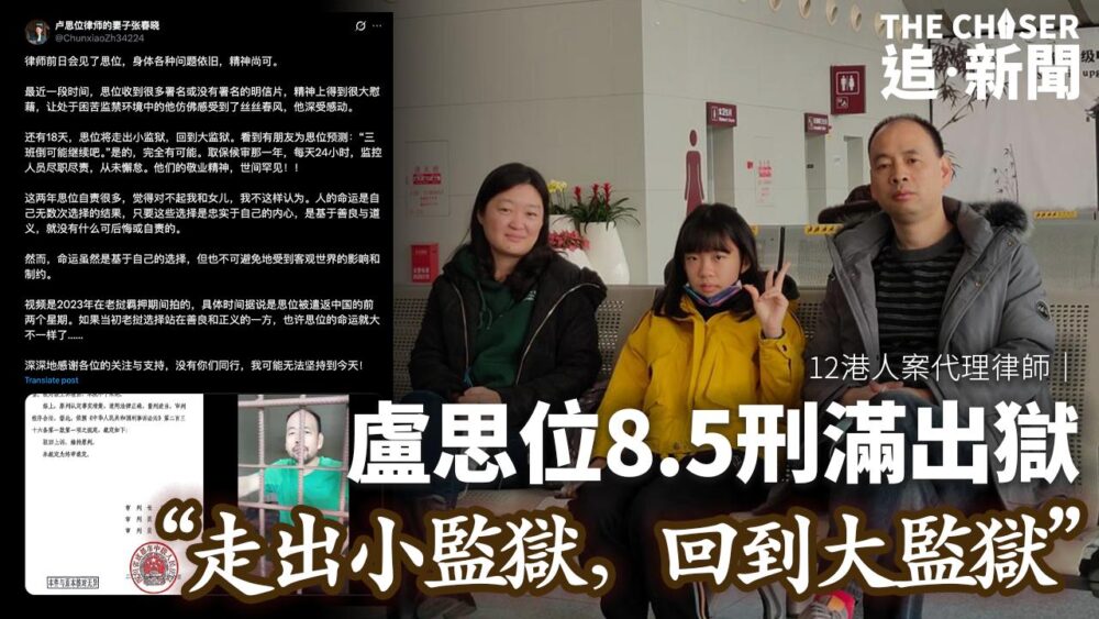 代理12港人案遭吊銷中國律師執業證的維權律師盧思位,20237月過境老撾準備經泰國飛抵美國與妻女團聚,卻被老撾警察拘捕並強行「送中」,折騰至今年4月才於成華區檢察院獲刑11個月。盧思位收到判決書後決定上訴,周三(16日)接獲成都市中級人民法院判決書指上訴理由不予採納,駁回上訴,維持原判。盧妻張春曉指:「根據判決書,盧思位將於85日走出小監獄,回到大監獄,他這6年的遭遇逼害的經歷,於時代而言不足為道:於個人和家庭而言卻值得銘記。」