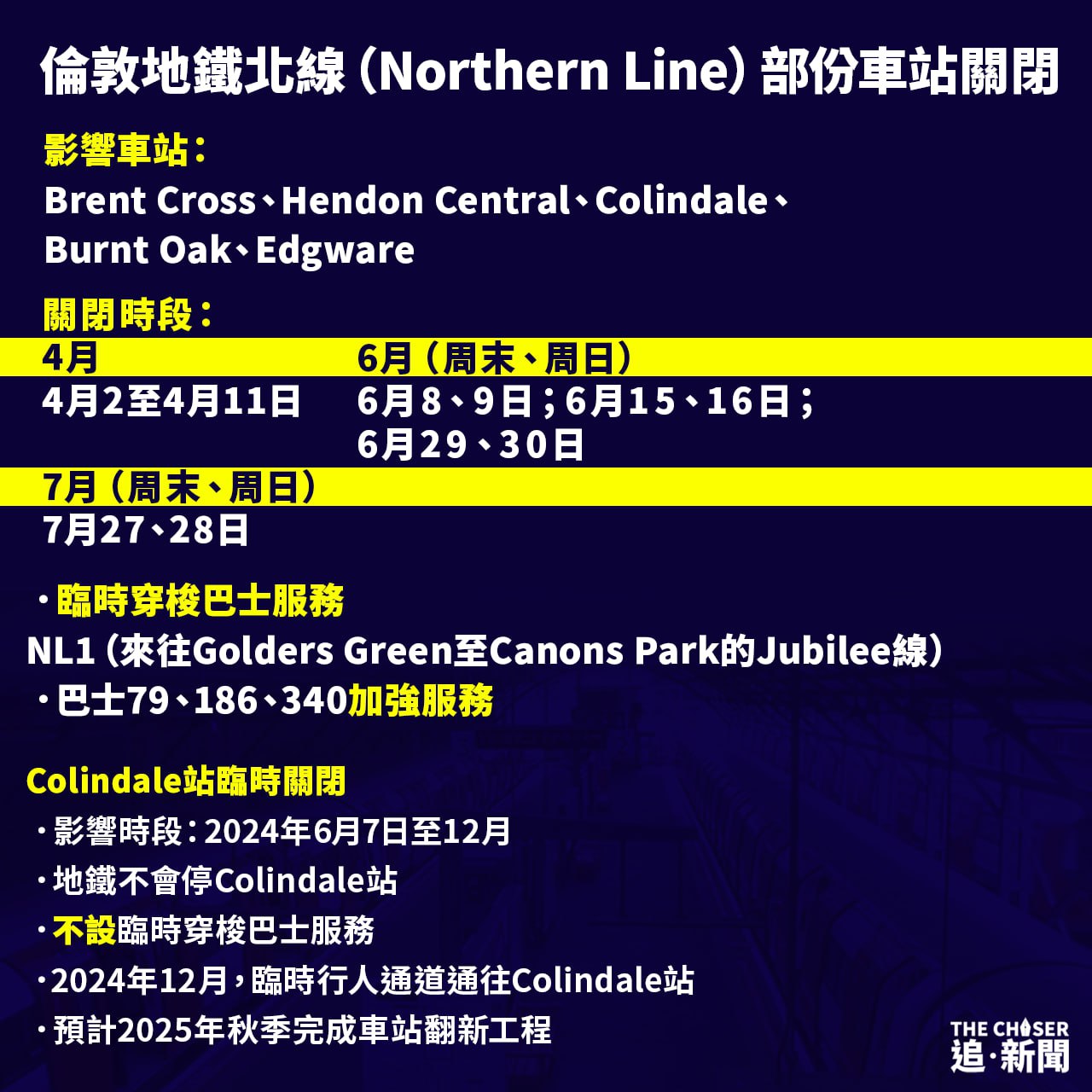 倫敦北線今日開始封5個地鐵站,為期10天,Colinedale站於6月7日將會封站近半年,究竟有何影響?請留意《追新聞》跟進報道。