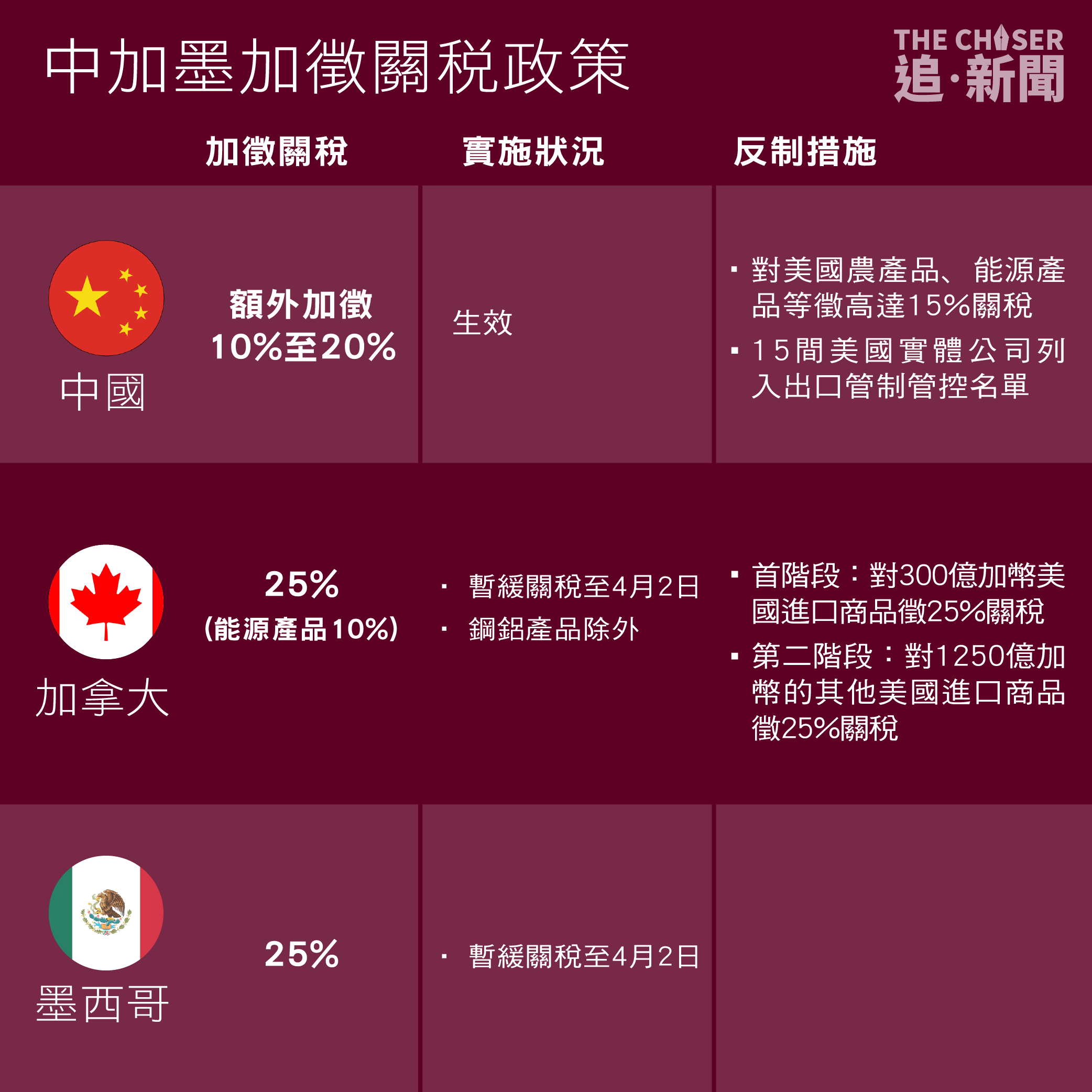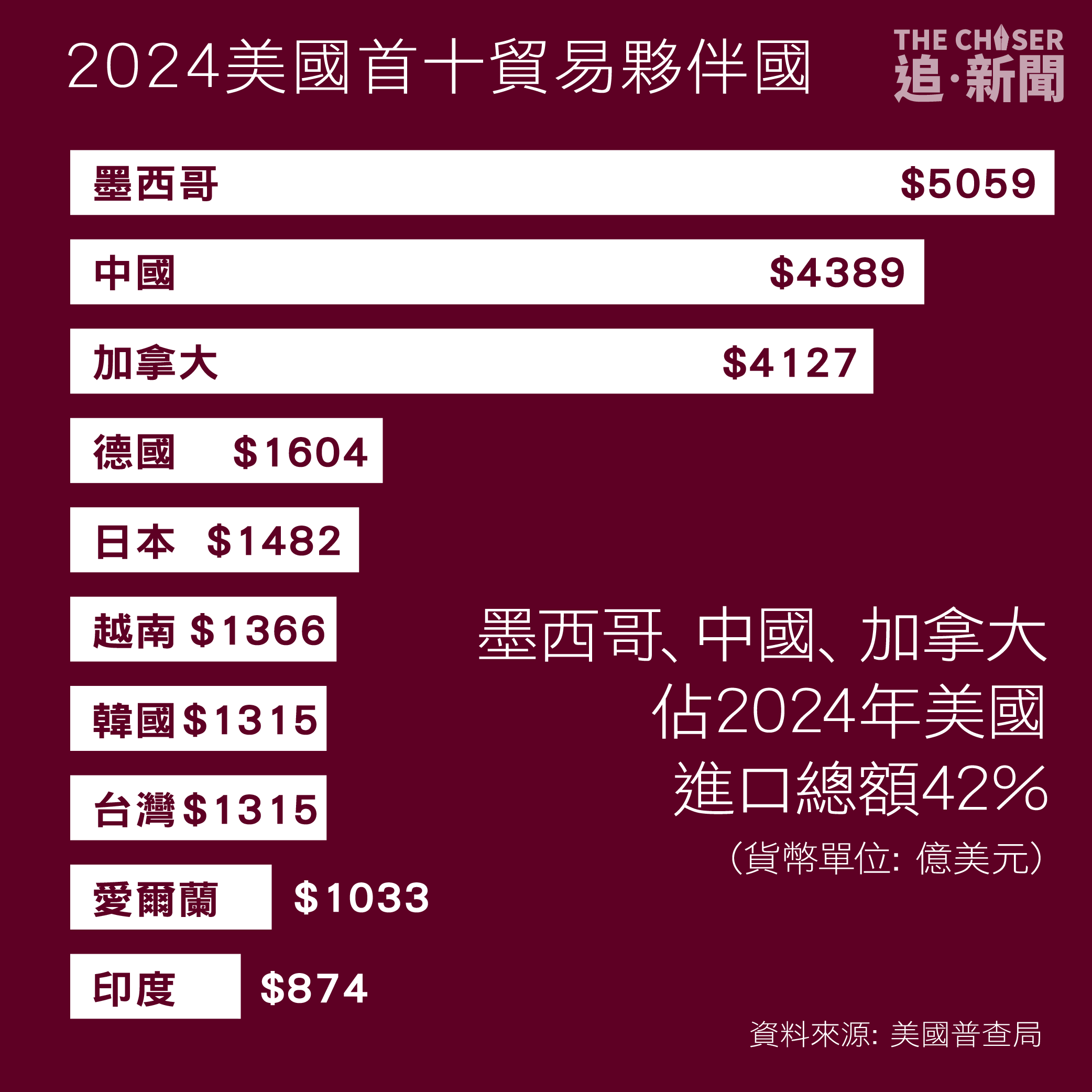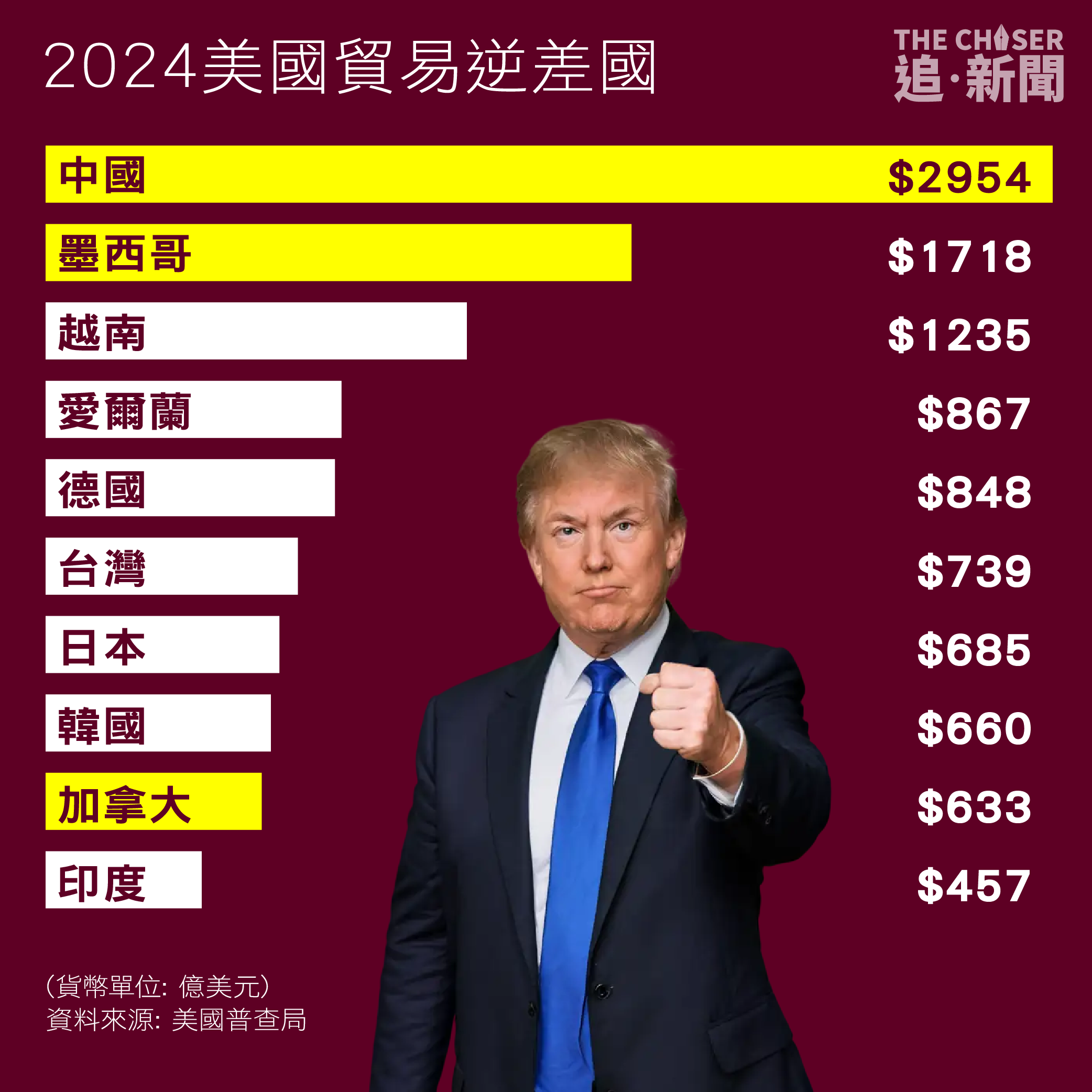 美國宣布對中國、加拿大和墨西哥徵收新一輪關稅,進一步加劇國際貿易緊張局勢,其中加拿大和墨西哥的關稅政策再度推遲一個月後實施。根據美國普查局數據顯示,中國﹑加拿大以及墨西哥佔2024年美國進口總額42%,中墨更是去年美國的貿易逆差最多的兩個國家,而美國與香港則有達219億美元的貿易順差。