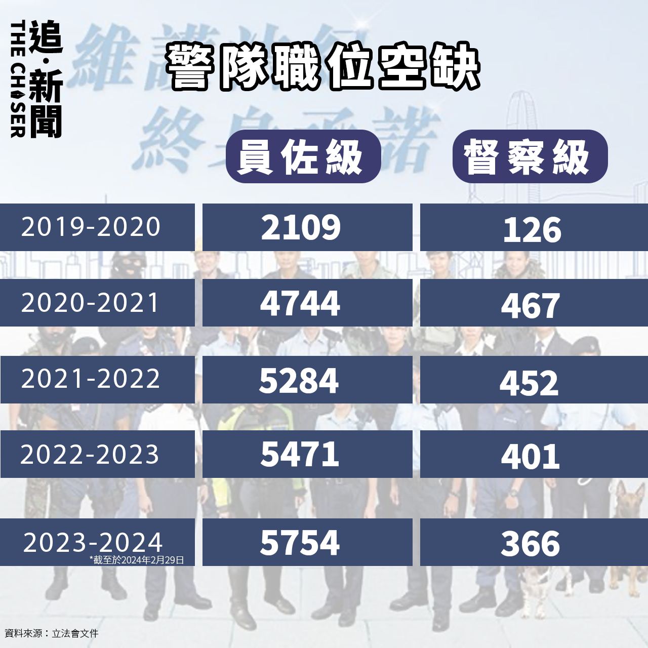 香港警隊員佐級職位空缺上升至5年新高,由2019-20年度的2,109個空缺上升至2023-24年度(截至2月29日為止)的5,754個,短短5年間包括警員、高級警員、警長及警署警長在內的初級警務人員職位空缺增加3,645個。雖然督察級職位空缺5年間由2020-21年度的467個下降至2023-24年度的366個,但已無法回到2019-2020年間的126個以及反送中運動前2018-19年度的98個空缺。