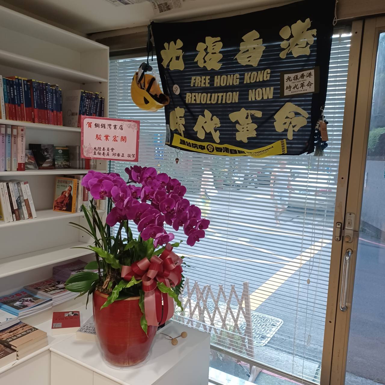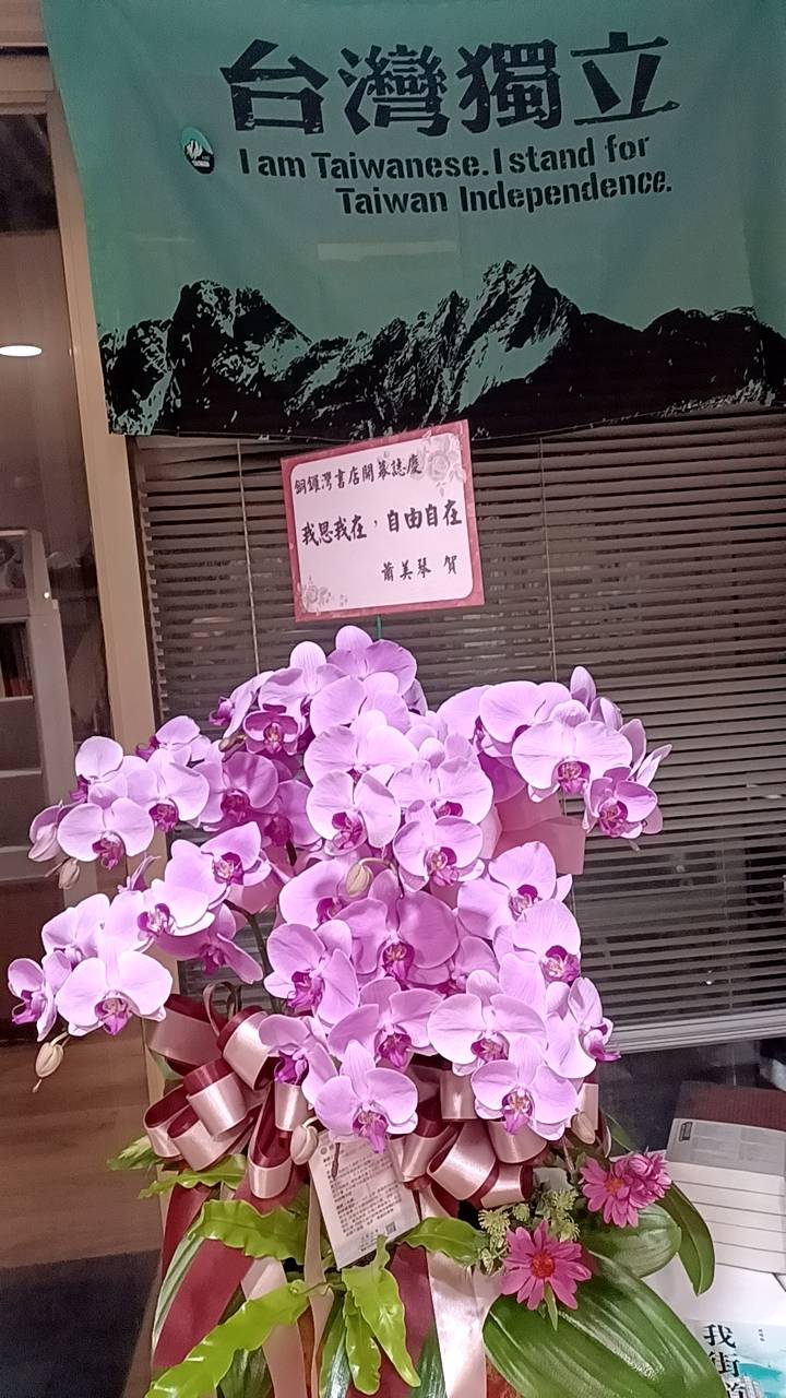 「光復香港,時代革命」黑底黃字旗幟以及「台灣獨立」藍底黑字旗幟高懸,蕭美琴送贈的花籃位於「台灣獨立」旗幟之下,丘垂正致送的花籃則放在光時旗之下,與「自由」、「民主」四個大字相對。蕭美琴的花籃,由多束桃紅蘭花組成,賀詞8個大字:「我思我在,自由自在」。台北銅鑼灣書店新址位於台北古亭金門街35號,毗鄰台電大樓捷運站,附近有台灣大學、台灣師範大學等大學校區,也靠近人稱台北舊書街的牯嶺街。林榮基表示,古亭店營業首日,有港人到書店看書,林一如以往,和讀者「傾偈」,交流互動。