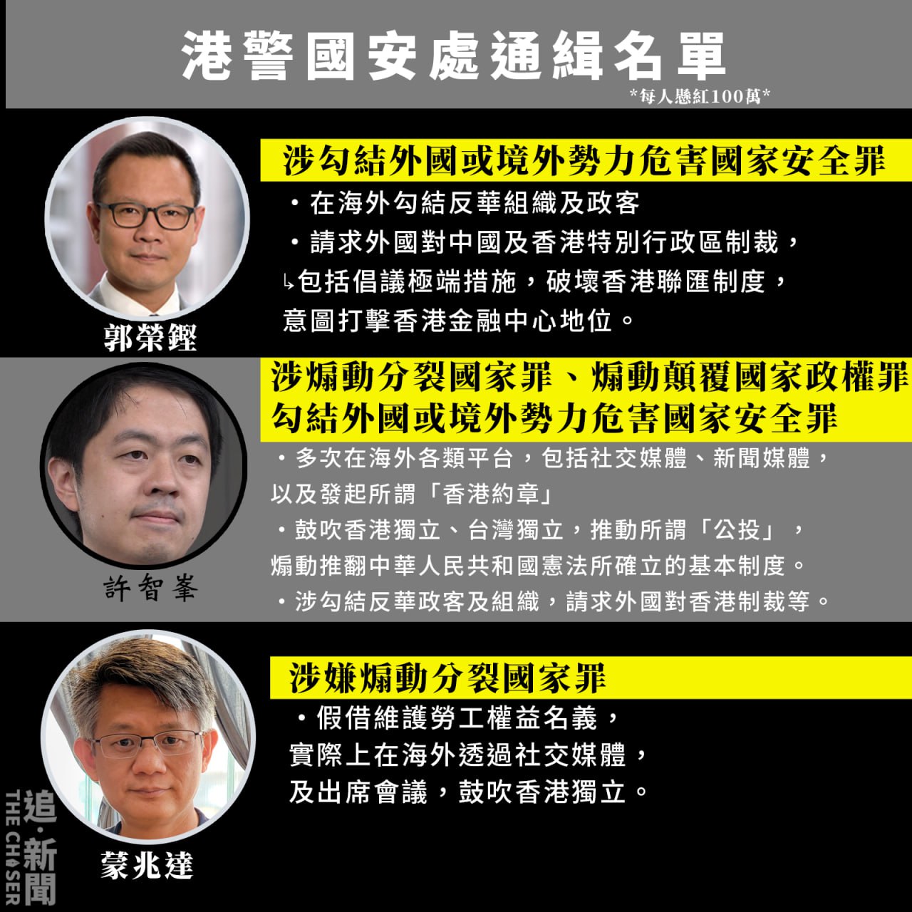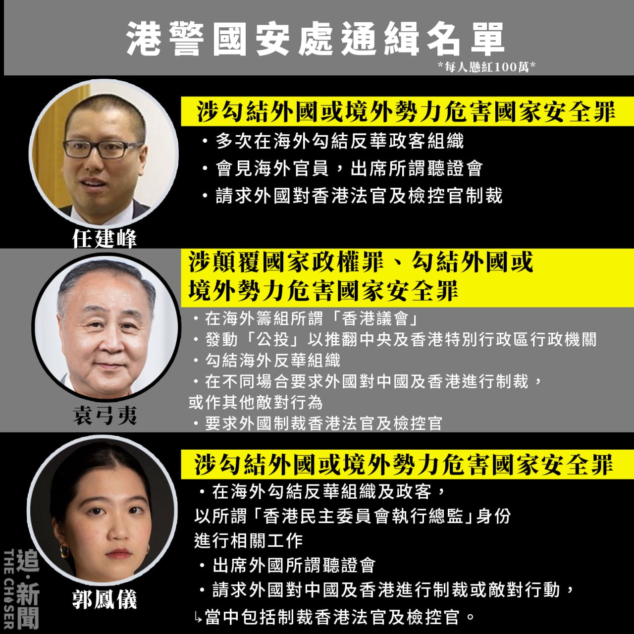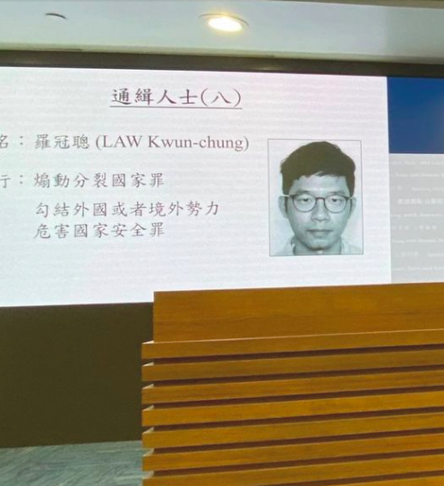 港警國安處總警司李桂華周一(3日)召開記者會,指法庭已批出拘捕令通緝8名境外人士,包括前法政匯思召集人任建峰、立法會議員容海恩家翁袁弓夷、香港民主委員會(HKDC)執行總監郭鳳儀、前公民黨執委郭榮鏗、前立法會議員許智峯、前職工盟總幹事蒙兆達、「攬炒巴」劉祖廸、前眾志創黨主席羅冠聰等8名境外人士,每人懸紅100萬港元,通緝他們歸案。