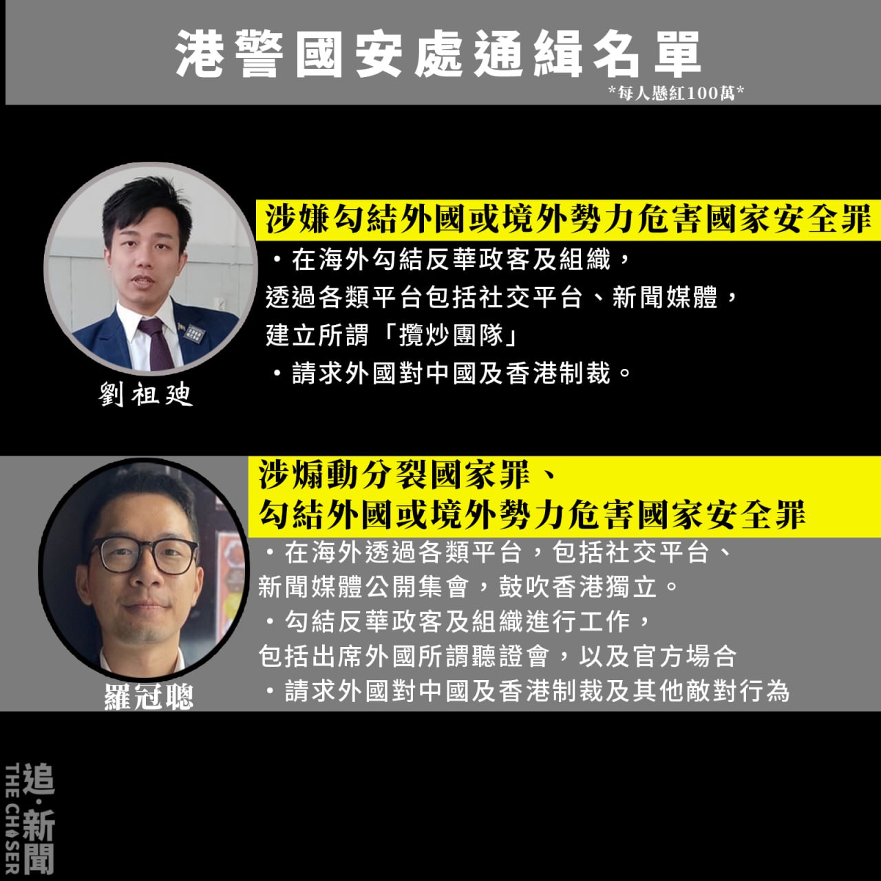 在英港人組織「香港協會」(HKUC)創辦人、現時獲英國政府政治庇護的前眾志創黨主席羅冠聰,在國安處發出通緝令後約3小時在Facebook發帖回應,指「連同名單上其他七位被告,恐怕多數都對此並不意外,自身過去被『通緝』的至少有六四維園非法集結案、選舉呼籲投白票案,目前再被確認以國安法通緝,其最大的差別只是多了一百萬懸紅。」