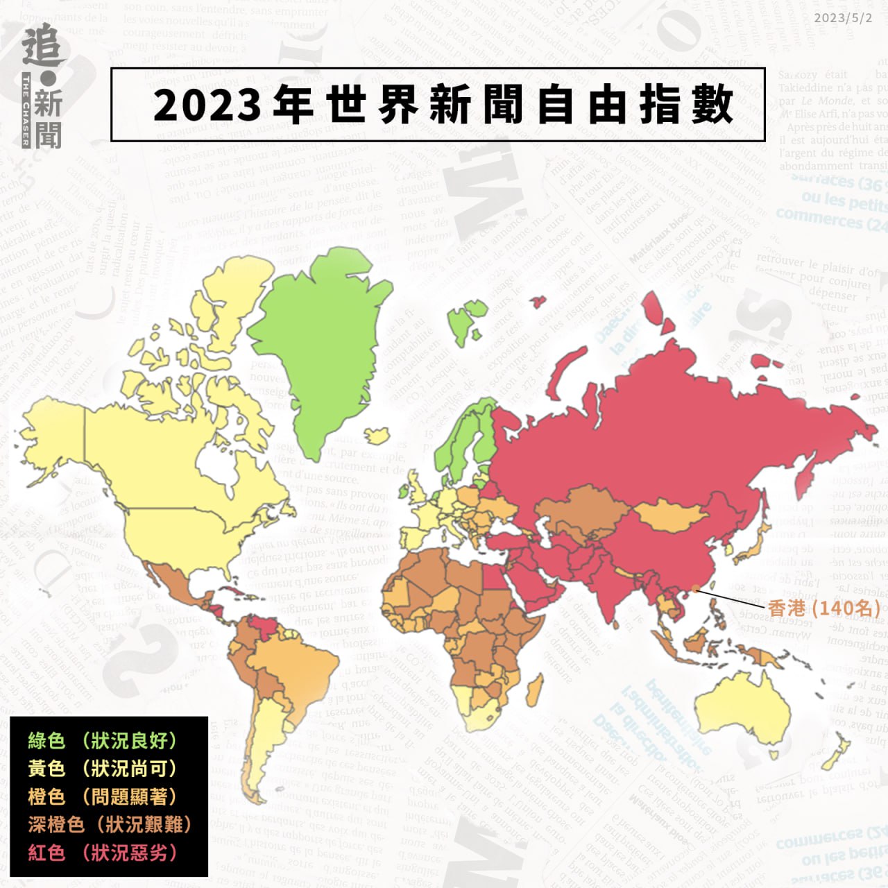 無國界記者(Reporters Sans Frontières, RSF)於周三(3日)「世界新聞自由日」,公佈「2023年世界自由指數」排名,評估180個國家和地區的新聞環境。《蘋果日報》、《立場新聞》高層被捕後,香港新聞自由自2021年的80位暴跌至去年148位,今年排名稍為回升至140位,但仍評為「狀況艱難」,與極權國家哥倫比亞、索馬里不相伯仲,還低於約束言論的新加坡(129位)。中國大陸由去年175位降至179位,排名倒數第二,報告指該國為「全球最大的記者監獄和宣傳內容輸出國之一」,現有100多名記者遭到監禁,「惡劣」狀況與伊朗、越南、北韓相若。