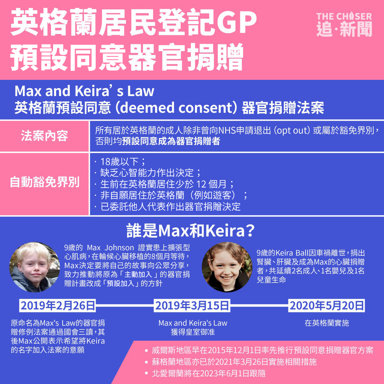 「惡意取消」器官捐贈在香港鬧得熱烘烘,李家超以刑事指控再為香港自由蒙上另一層白色恐怖;這邊廂在港人的「第二家園」亦已推行「預設同意(deemed consent) 器官捐贈法」。英國四個組成國正逐步實施相關政策,規定所有居民向普通科門診(GP)登記時,須就意願選擇退出(opt-out)器官捐贈計劃,除非屬豁免類別,否則均預設同意成為器官捐贈者。