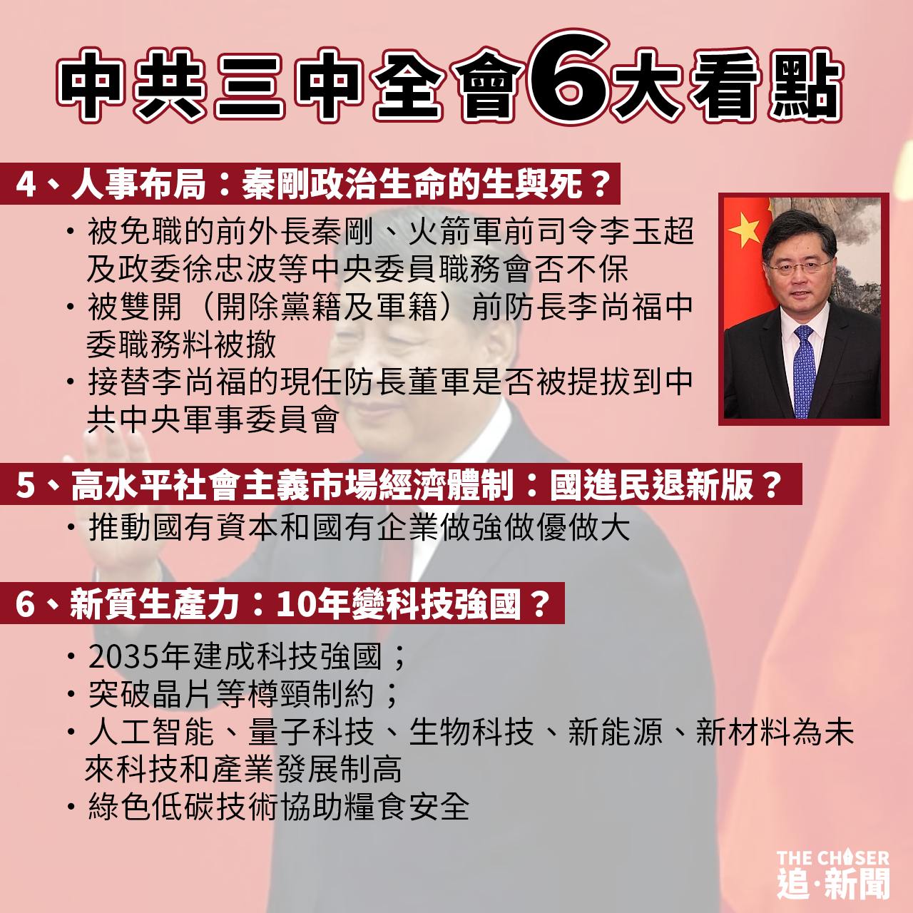 中國發展處於水深火熱之際,中共第二十屆三中全會周一(15日)一連四日在北京舉行,習近平如何處置「親信」、前外長秦剛、如何對付李尚福,魏鳳和等「叛將」;以及習近平權力會否進一步擴大、中國「國進民退」會否進一步發展以及中國農村會否走回「人民公社」老路,均是今次會議的超熱重點。