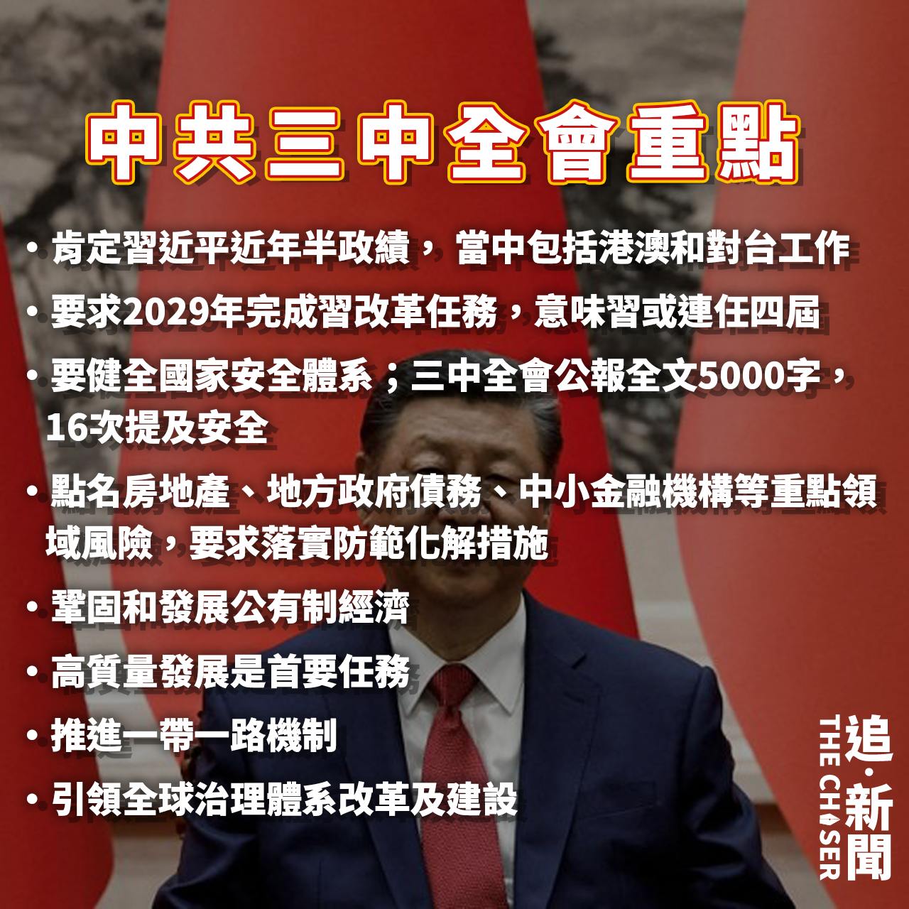 香港《基本法》23條加速立法,香港樓價持續下跌,全港爆發店舖執笠潮;中國房地產泡沬爆破、地方債務危機湧現、青年失業率完善後逼近15%。中共總書記習近平永續元年政績有目共睹。周四(18日)閉幕的中共第二十屆三中全會為他添上新衣。會上通過進一步全面深化改革決定,要求2029年完成習提出的改革任務,意味習或連任四屆。香港特首李家超指三中全會對香港有深刻影響,強調香港應更好地融入國家發展大局。