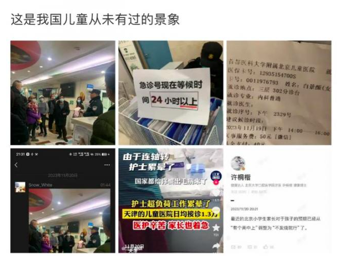 北京天壇醫院兒科門診候診患者人數,每日維持400至500人,較以往增加3、4倍;北京兒童醫院、首都兒科研究所日均應診更超過7,000人,有家長更自備摺椅「打點滴」。大部分兒童出現「白肺」,其中北京、大連情況最為嚴重。根據中國網民在社媒指:「兒童出現『白肺』需要接受俗稱『洗肺』的手術, 所謂的洗肺就是患者全身麻醉後,灌入清洗液,加上拍痰來清除肺部裏的蛋白質,將肺清洗乾淨。 中共對今次疫情仍然採取隱瞞不報的行為,牆內要想討論都會被噤聲。」