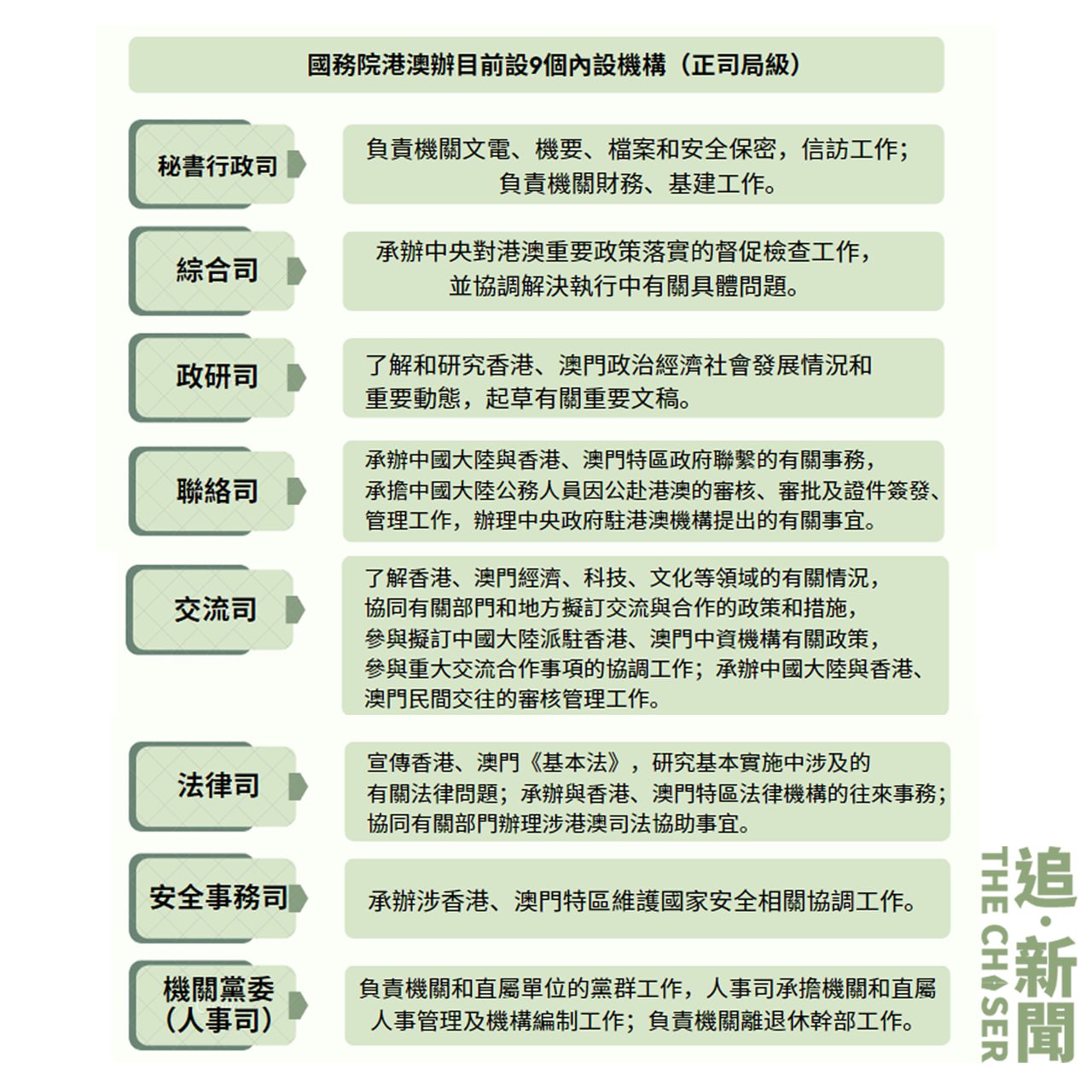 《星島日報》引述接近港澳系統的建制派消息指出,中央港澳辦將在國務院港澳辦基礎上增擴大編制,可能至少增加一個局,也就是由現在在的「9司」增至「10局」,原有的「9司」將被打散,職能和名稱都會有所更改。
