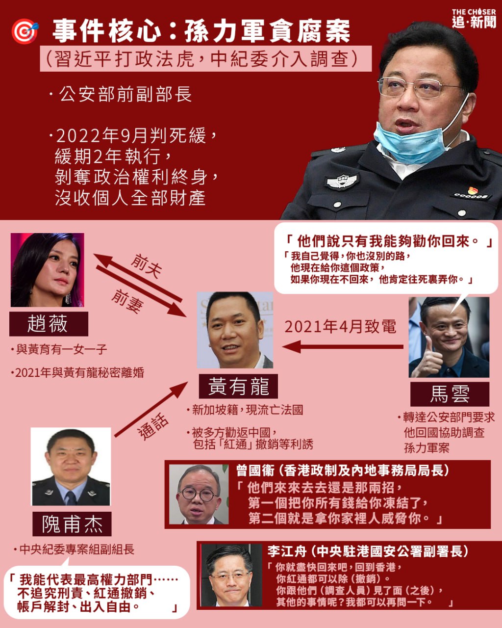 除了馬雲外,當時負責孫力軍案的中央紀委專案組副組長隗甫杰也致電黃有龍:「我和你太太聊(過)天呢,相信我,我能代表我所能代表的最高權力部門來給你說這些話,不追究,再加一個對你的紅通撤銷……不追究你刑事責任,出入自由,把你(銀行)賬戶解封……」