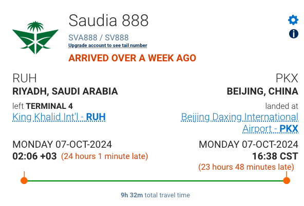 事發於上周日(6日),原定於凌晨2時06分起飛的沙特阿拉伯航空SV888,在利雅得國際機場直航到北京。機場先說航班延誤兩個小時,後來