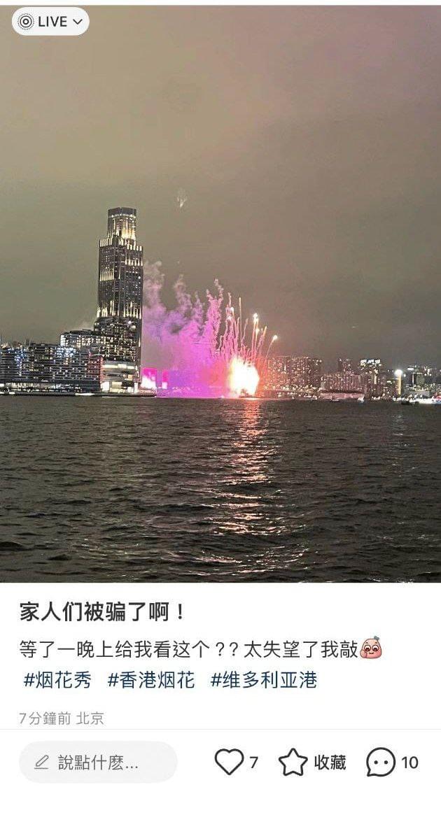 據連登討論區截圖,有地點在北京的「小紅書」用戶大呻家人們被騙了看煙火,「等了一晚給我看這個??太失望了」,並以 Hashtag標籤「烟花秀」、「香港烟花」、「维多利亚港」。