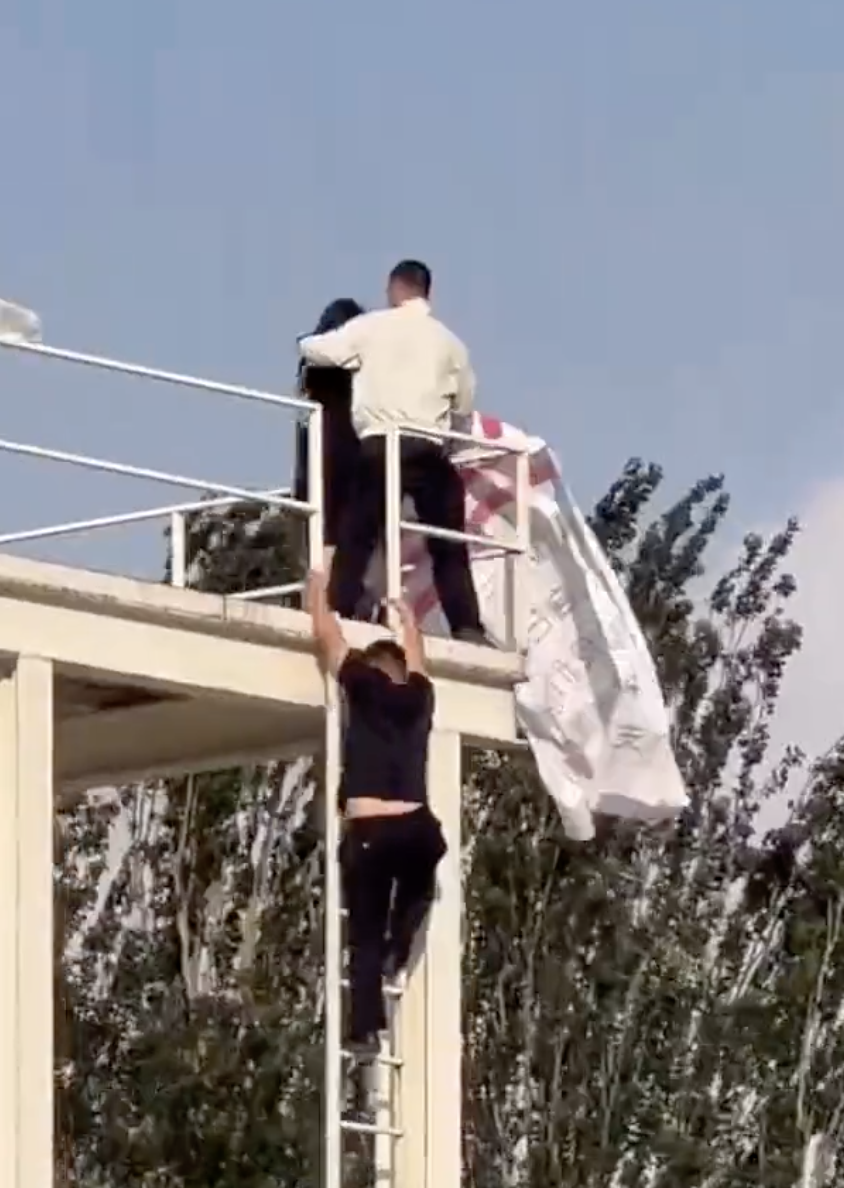 「李老師不是你老師」發放的網友提供片段顯示,台灣天團五月天在北京烏巢舉行演唱會,吸引大批年青歌迷聚集。一名穿上黑衣的女子突然爬上鳥巢玲瓏塔上,張開美國國旗,拋發印有《獨立宣言》傳單。兩名相是保安人員的男子見狀立即登塔制止。