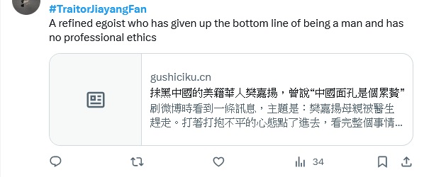 《紐約客》記者樊嘉揚是另一名受害者,她在2019年反送中運動期間多次報道香港局勢,結果被網軍滋擾,部分人張貼醜化她的圖畫,更有人散播謠言稱她對母親謀財害命。美國克萊姆森大學行為、社會及健康科學學院教授林維爾(Darren Linvill)指出,社交平台最少有1.2萬個標註樊嘉揚為「叛國者」的標籤「#TraitorJiayangFan」,指控她「抹黑中國」以至「跪舔美帝」。