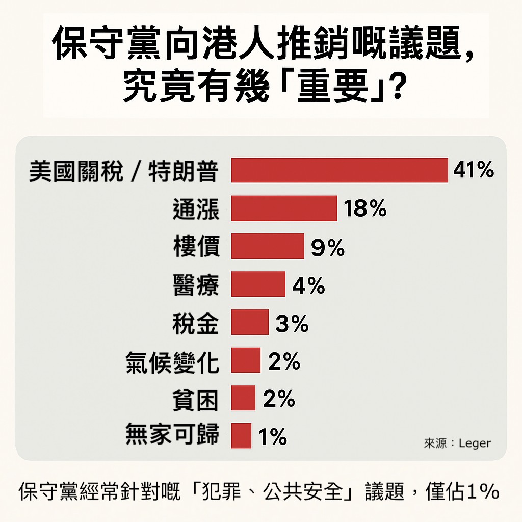 今年3月17日民調公司Leger的研究報告指出,41%加拿大選民擔心特朗普的關稅及侵略、18%關心通漲、10%關心樓價可負擔程度、9%擔憂醫療系統;保守黨重點向港人移民推銷的議題,如計入「罪案與公共安全」一項,僅佔1%不到,敬陪末席;性別教育議題,更是十大不入。
