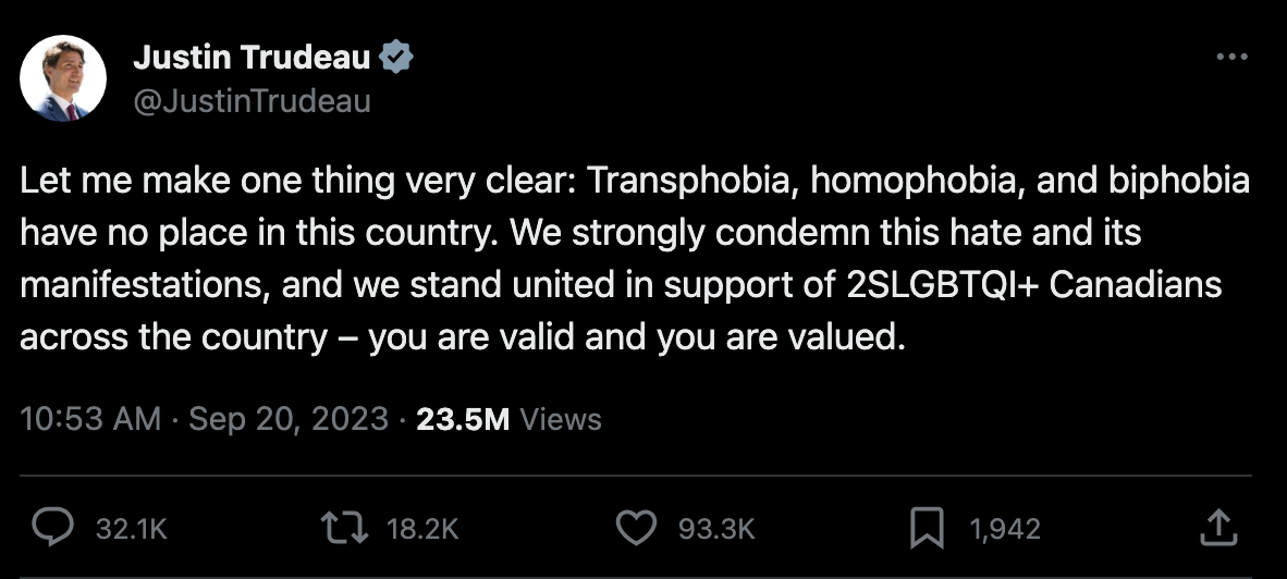 加拿大總理杜魯多在官方推特發表的讉責言論原文。