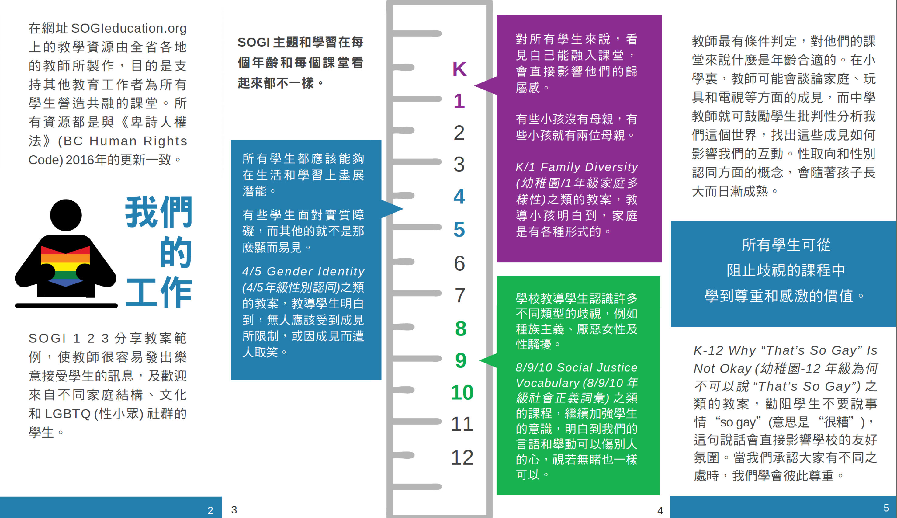 SOGI 3:制定包容性的卑詩省教學大綱,把SOGI議題和列舉性小眾社區成員的例子,透過教學反映學生生活和社會中的SOGI的多元。