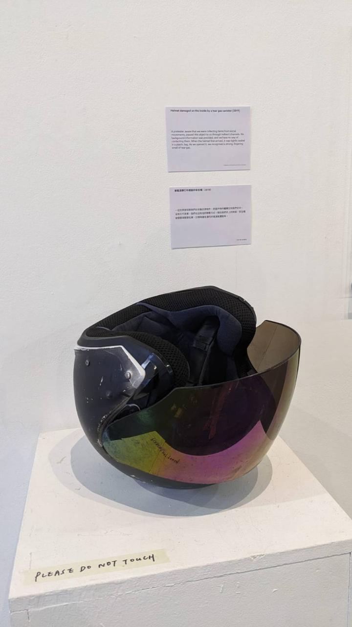 30年後,在香港的街頭,另一場抗爭燃起。一名示威者戴著電單車頭盔,在催淚彈煙霧中疾奔。頭盔是從內裡被打穿,策展人稱頭盔一直放在貨倉,剛剛拿出來展覽,散發燃燒塑膠味道味道。頂頭盔靜默地躺著,被展示、被回憶,將人拉回2019年的香港街頭,但曾經戴著它的人是否仍安好?