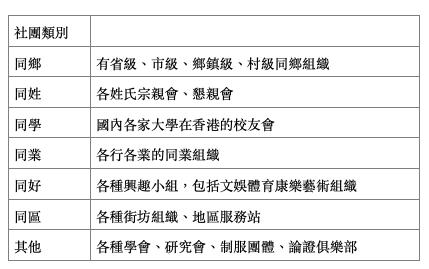 這批社團,種類繁多,筆者嘗試以「六同」來歸納它們:同鄉、同姓、同學、同業、同好,同區,無法以「同」分類的,就以「其他」歸納,見下表: