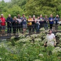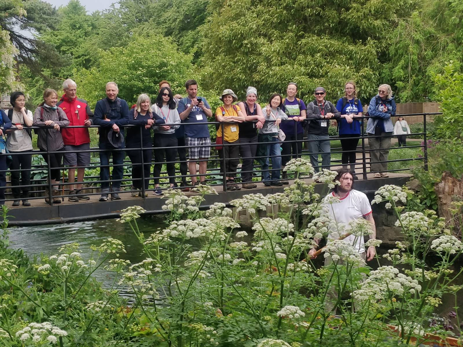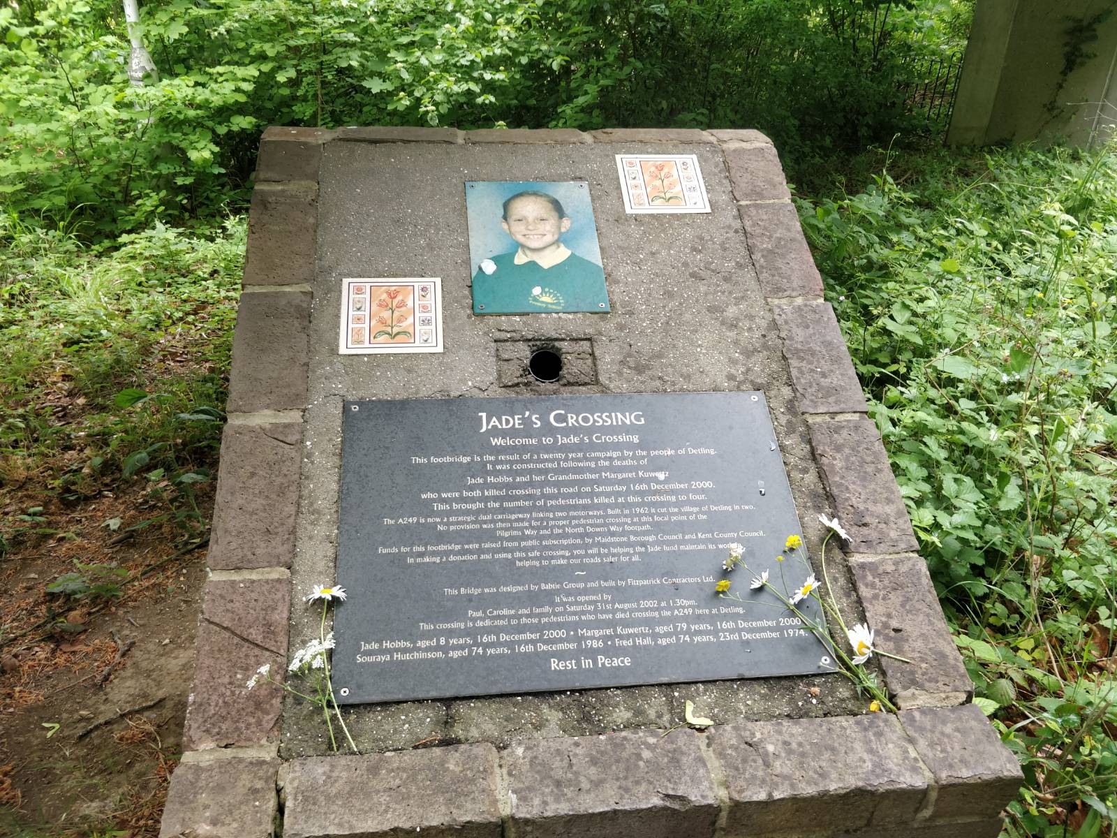 筆者發現Peter喋喋不休、步履蹣跚,隊友耐心聆聽,有時就跟他搭訕,分散其注意力。筆者好奇心驅使下問他,才知道原來Peter行足35年,由第一屆行到今年第35屆,筆者興奮地恭喜他即將完成創舉,他笑說:「No……no……還未完成,要到坎伯雷特座堂才算35年啊。」在經過高速公路旁,Adam則沿途執垃圾。跨過A249公路一條行人天橋,命名為「Jade’s Crossing」,立碑紀念2000年12月16日8歲女童Jade Hobbs橫過公路十字路口慘死,這條奪了4條人命的公路天橋,經居民集資和市政府撥款後才得以興建。