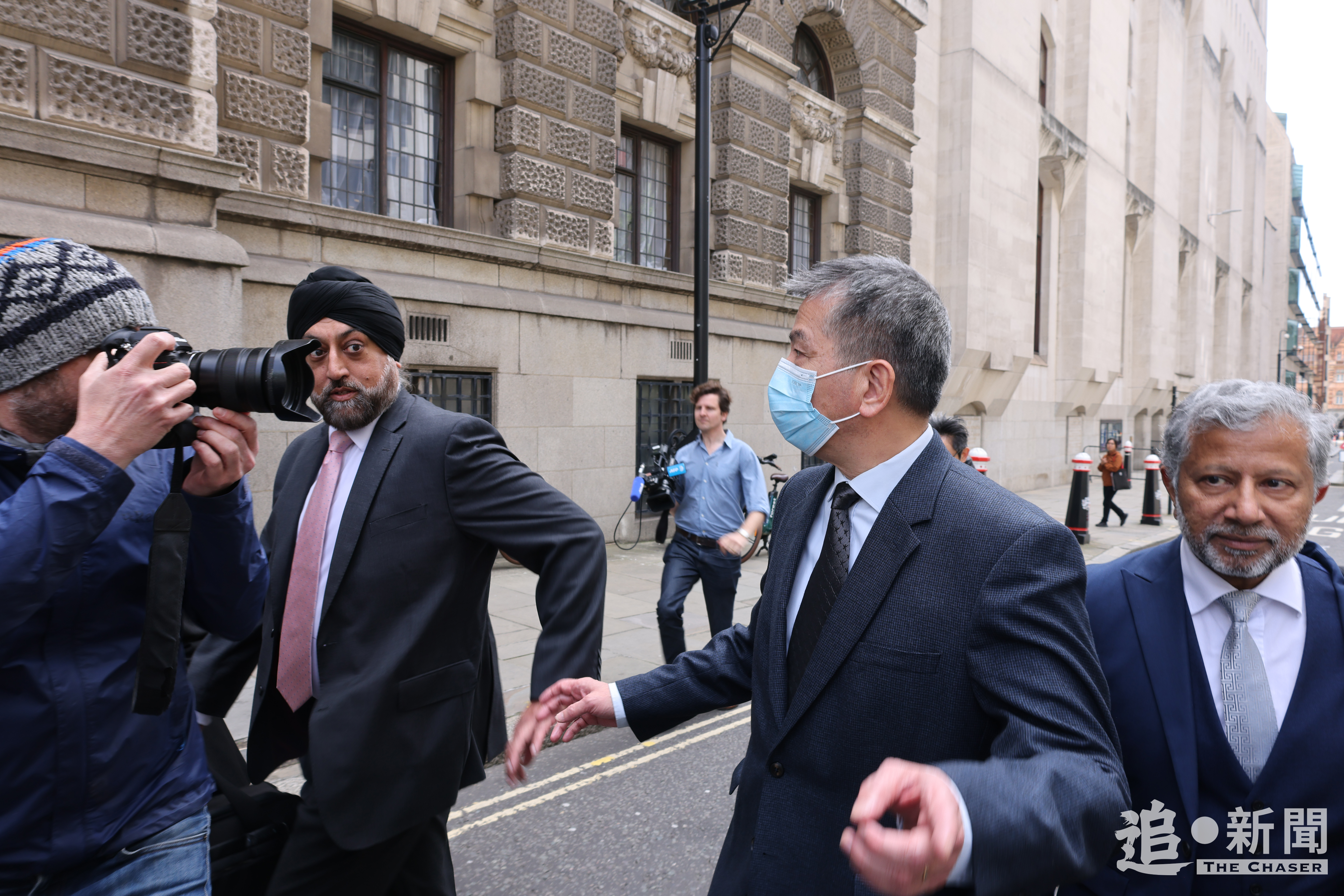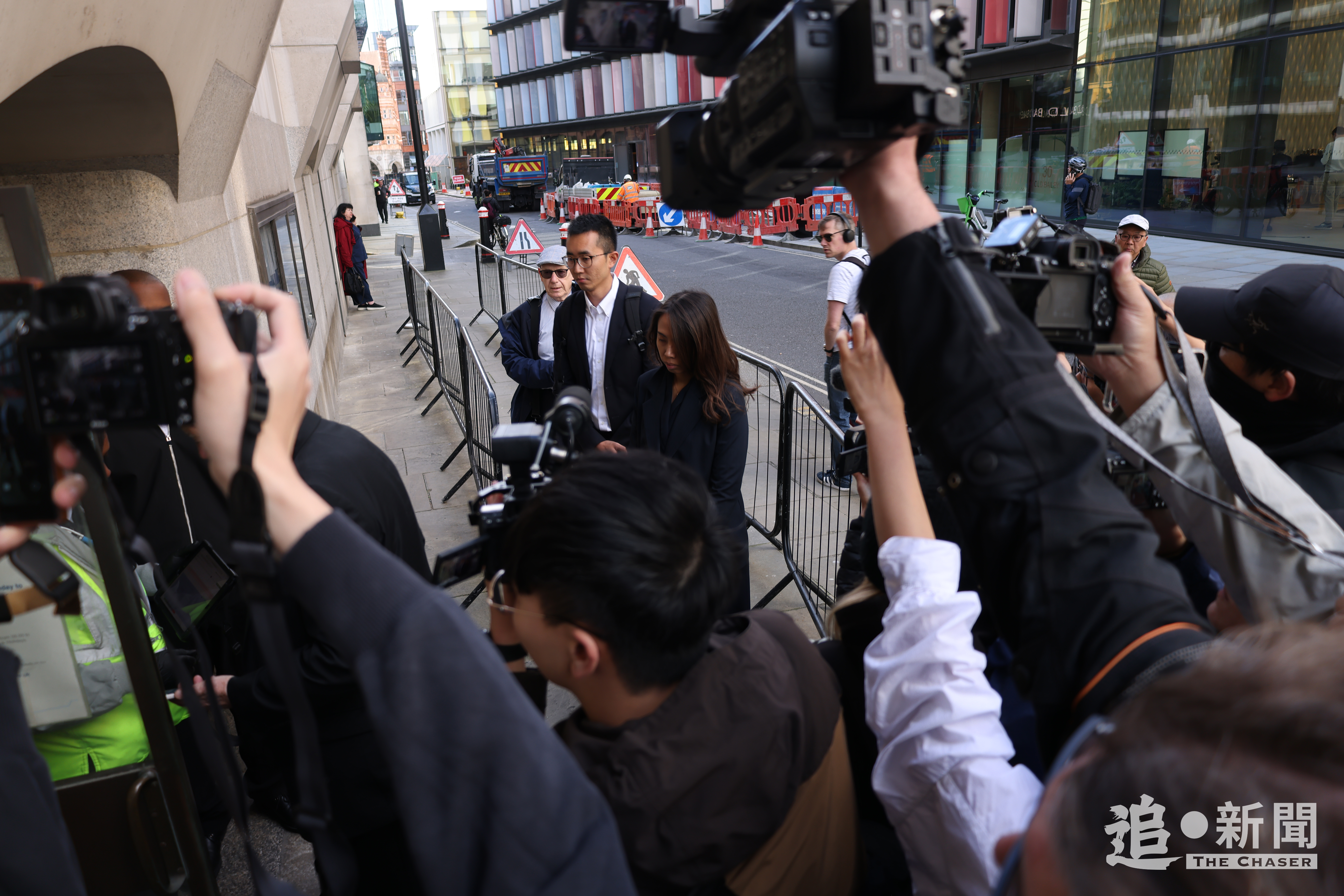 ▲倫敦經貿辦副處長黃凱鈴(右二)及助理處長胡文匡(右三)要由公眾人士通道進入法院。