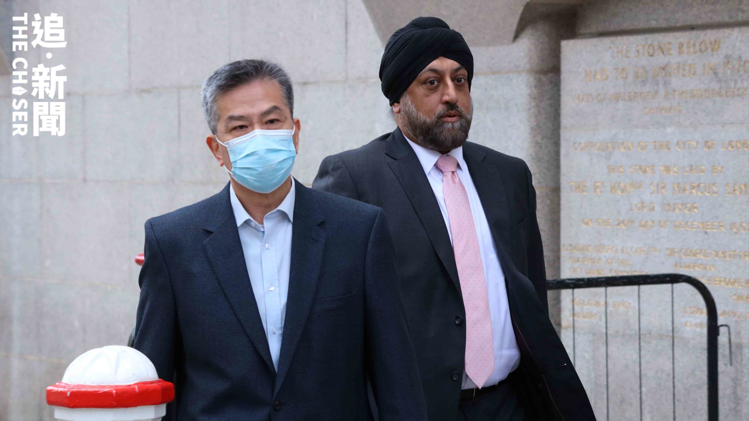 袁松彪由代表律師Sailesh Mehta(右一)、Harry Rana(左一)陪同離開法院。