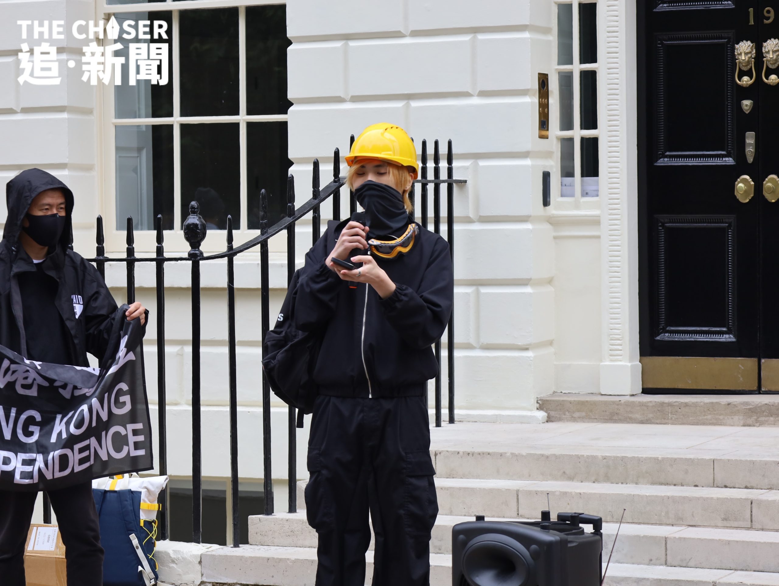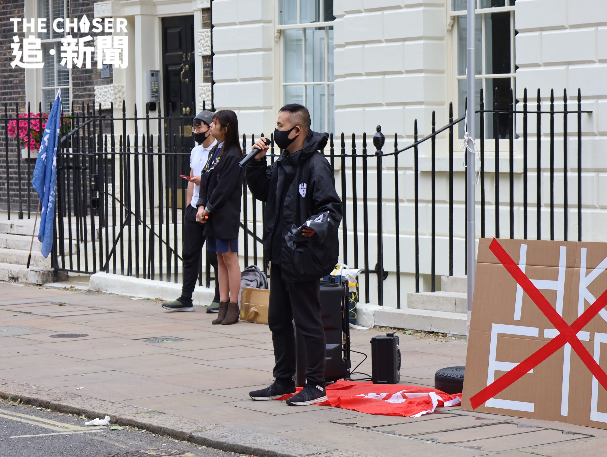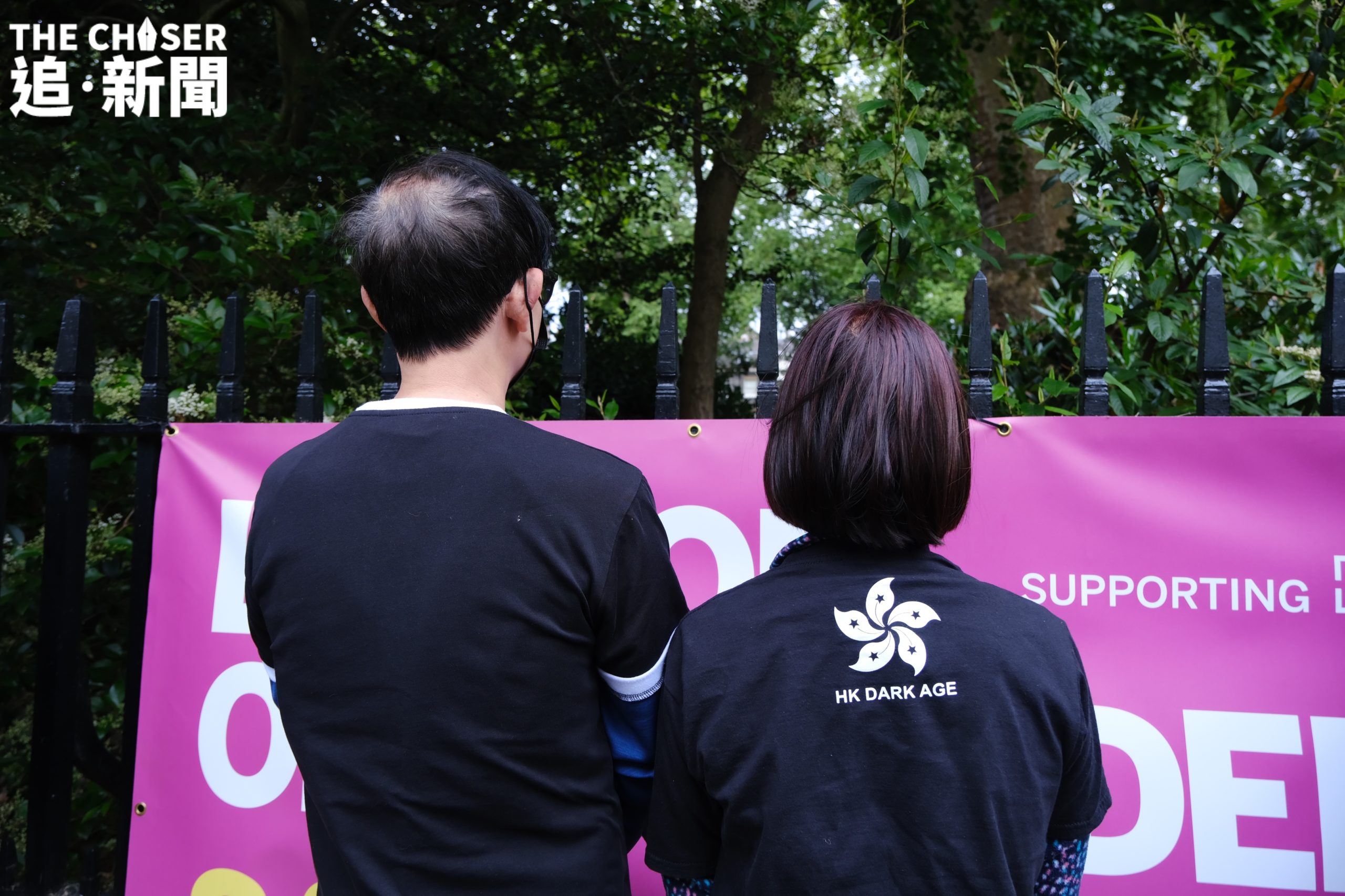 年過六旬、已退休的譚氏夫婦身穿印有黑洋紫荊旗的T-shirt到場,站在最後排靜靜觀望。早已放棄回港的他們,對於英國存在間諜一事毫不驚訝,亦未有因此而膽怯畏縮。即便如此,譚太仍然深感欷歔:「喺一個民主國家參加集會,都仲要戴住口罩,遮住個樣,我覺得好悲哀」。