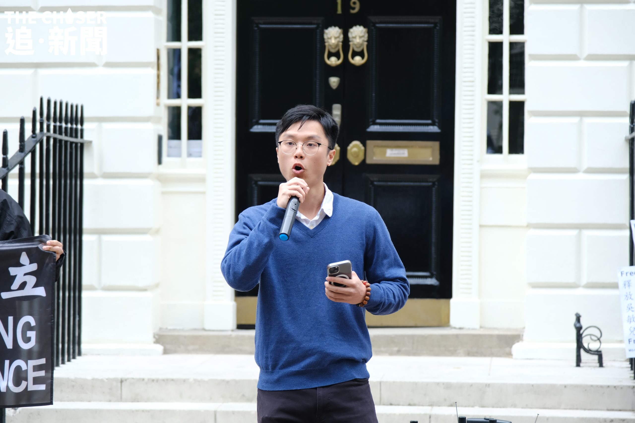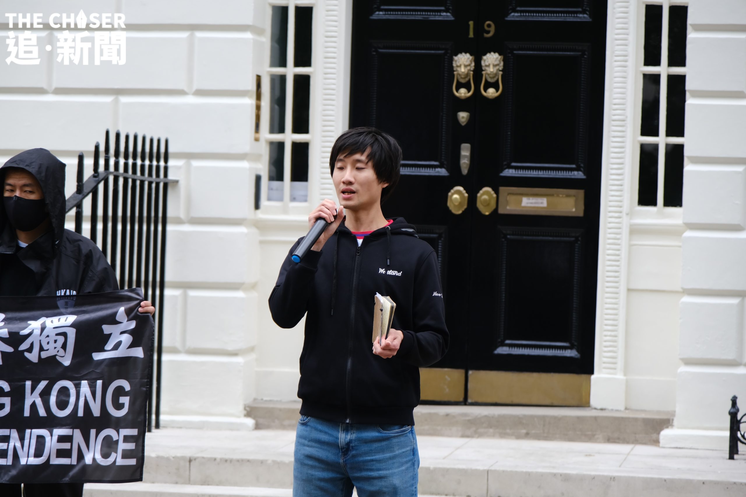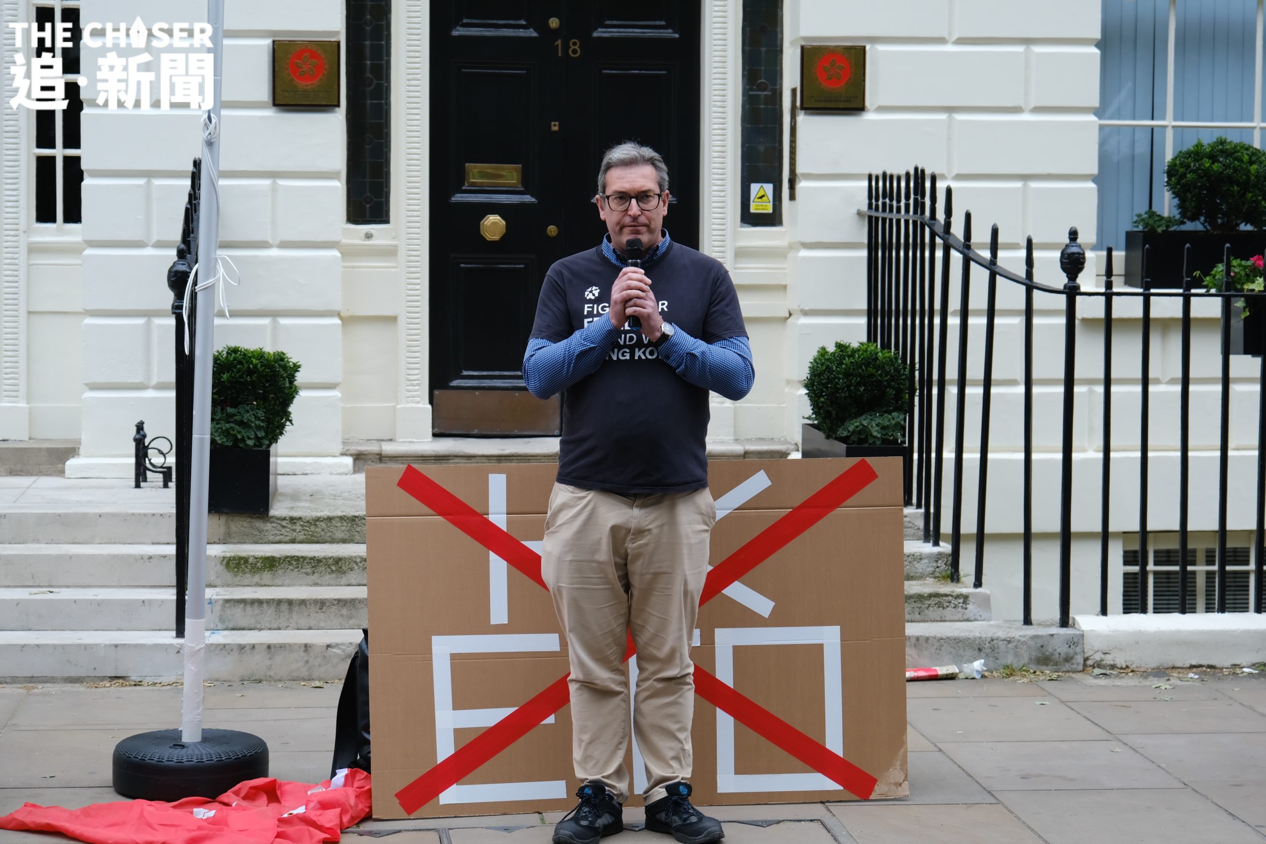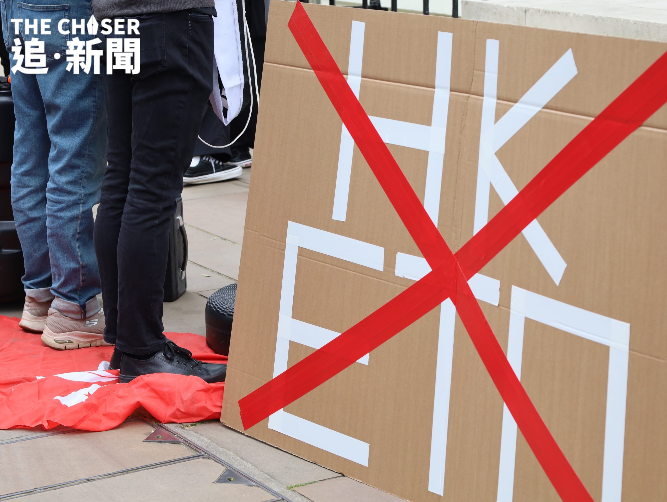 年過六旬、已退休的譚氏夫婦身穿印有黑洋紫荊旗的T-shirt到場,站在最後排靜靜觀望。早已放棄回港的他們,對於英國存在間諜一事毫不驚訝,亦未有因此而膽怯畏縮。即便如此,譚太仍然深感欷歔:「喺一個民主國家參加集會,都仲要戴住口罩,遮住個樣,我覺得好悲哀」。