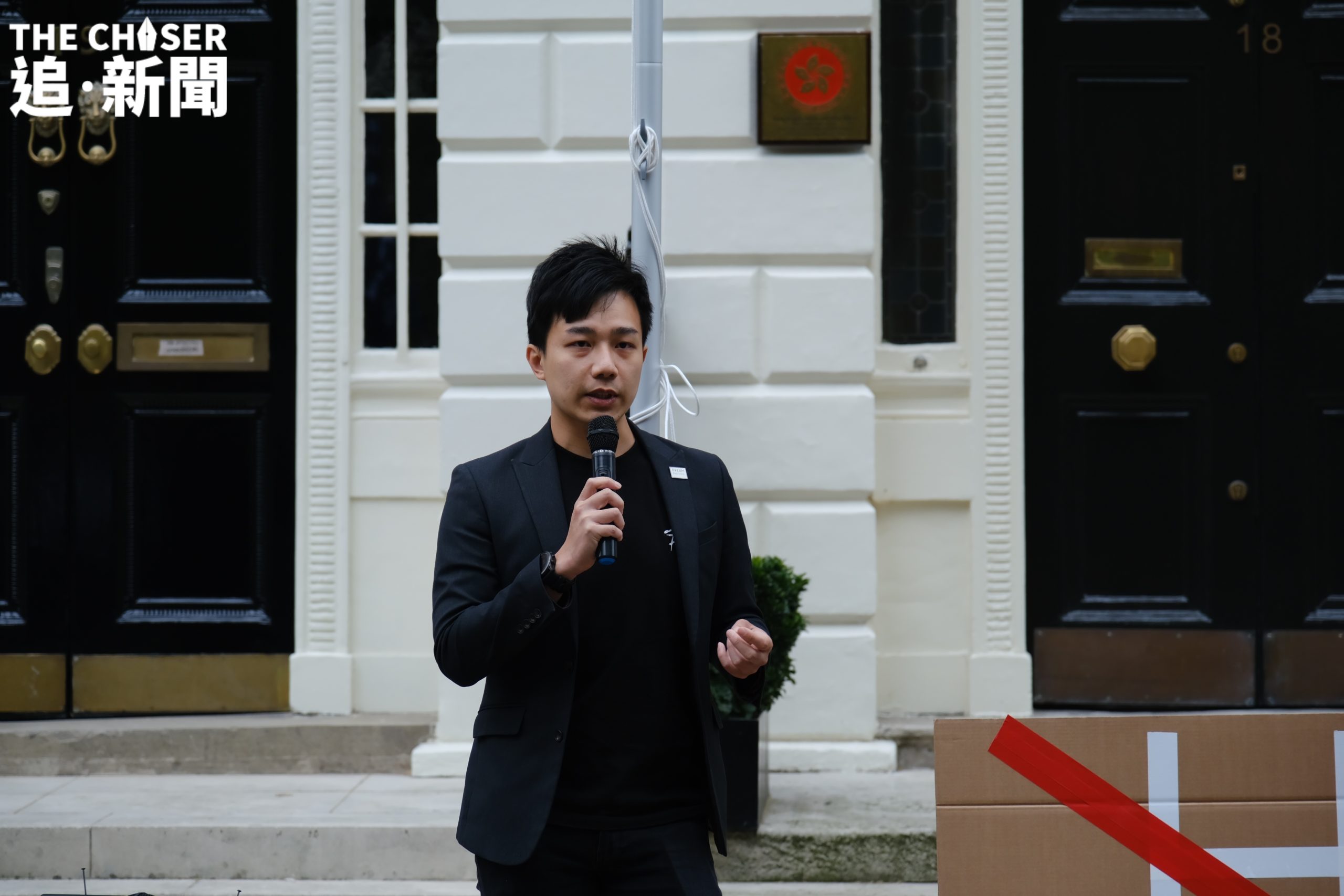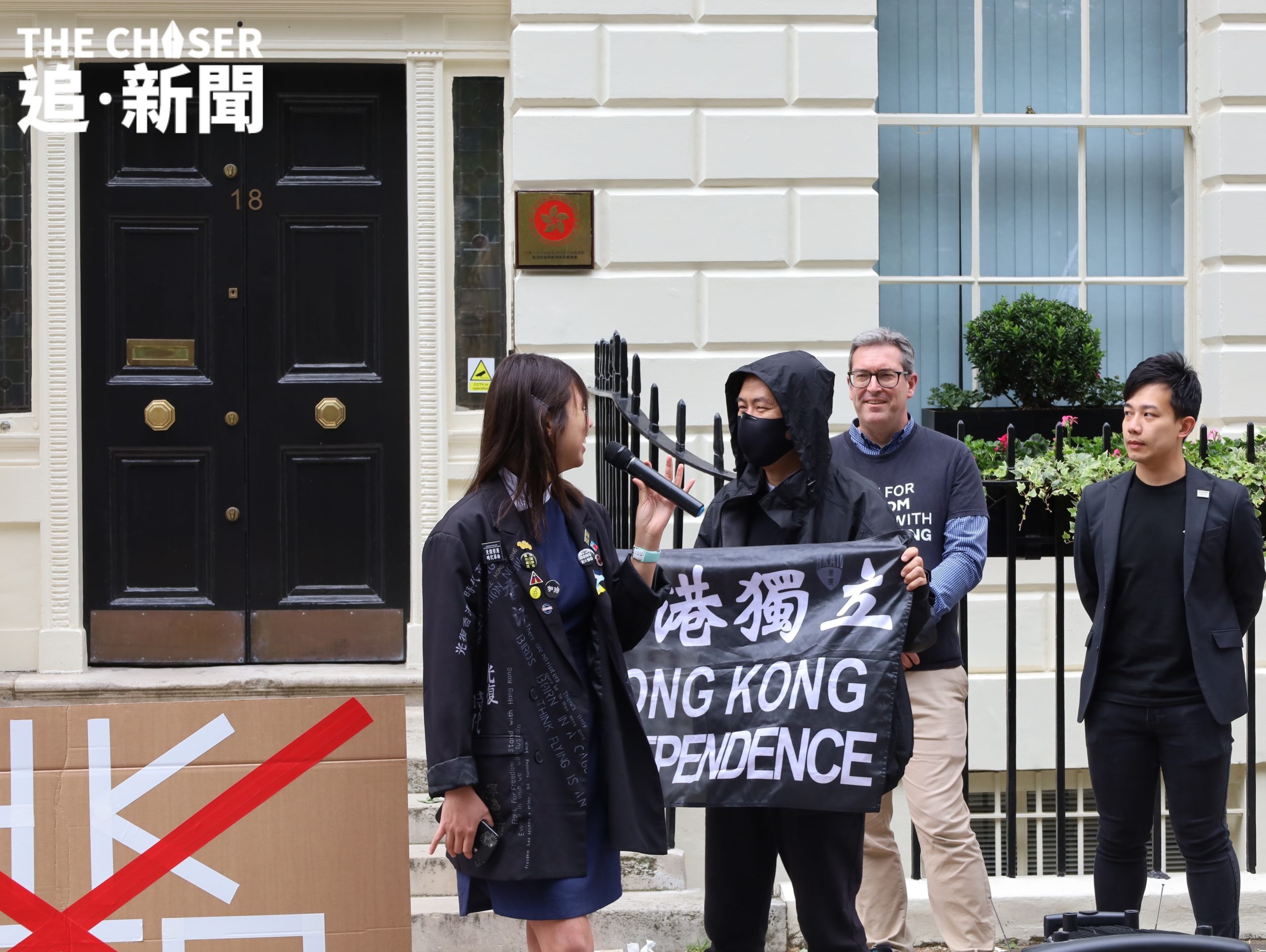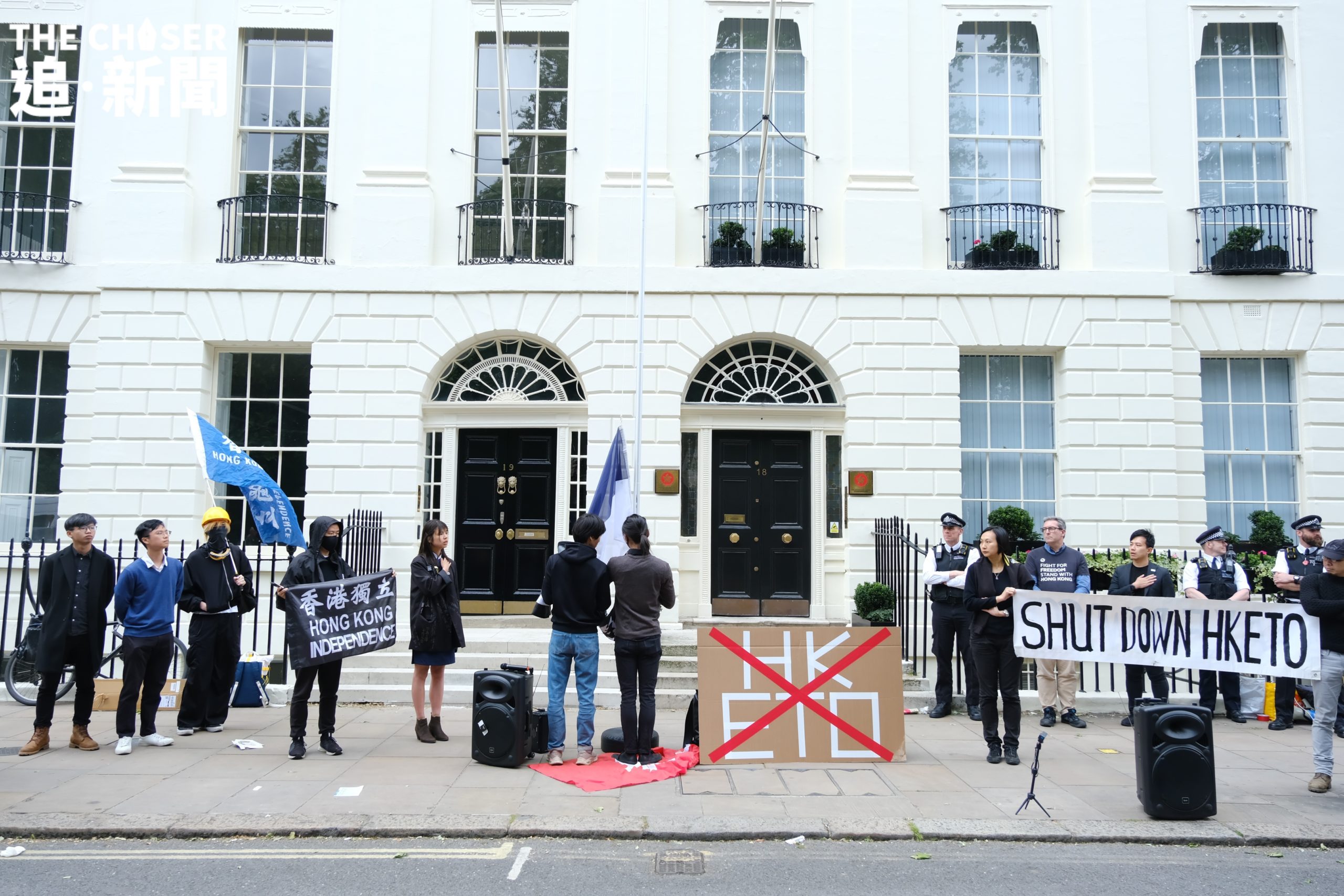 主辦方在香港經貿辦外竪立臨時旗桿,並在集會前進行升旗禮。在《願榮光歸香港》歌聲中升起部份抗爭者視為「香港國旗」的藍白旗幟,以及「光時」旗。集會由多個在英團體主辦,如港援、細葉榕人道支援基金、D4HK、 HKersUnited、英國港僑協會等等。現場情緒高漲,不少人揮動香港獨立旗,眾人高呼「光復香港 時代革命」、「香港獨立 唯一出路」等口號。有人舉起寫有「關閉經貿辦」、「間諜活動」字眼的自製紙牌。英國人權組織「香港監察」創辦人羅傑斯(Benedict Rogers)表示,經貿辦成立於香港仍享有高度自治的年代,象徵着香港的利益;惟現時經貿辦只效忠中共,象徵中共遠至海外的打壓,呼籲英國政府關閉經貿辦,撤銷相關官員的外交豁免權。