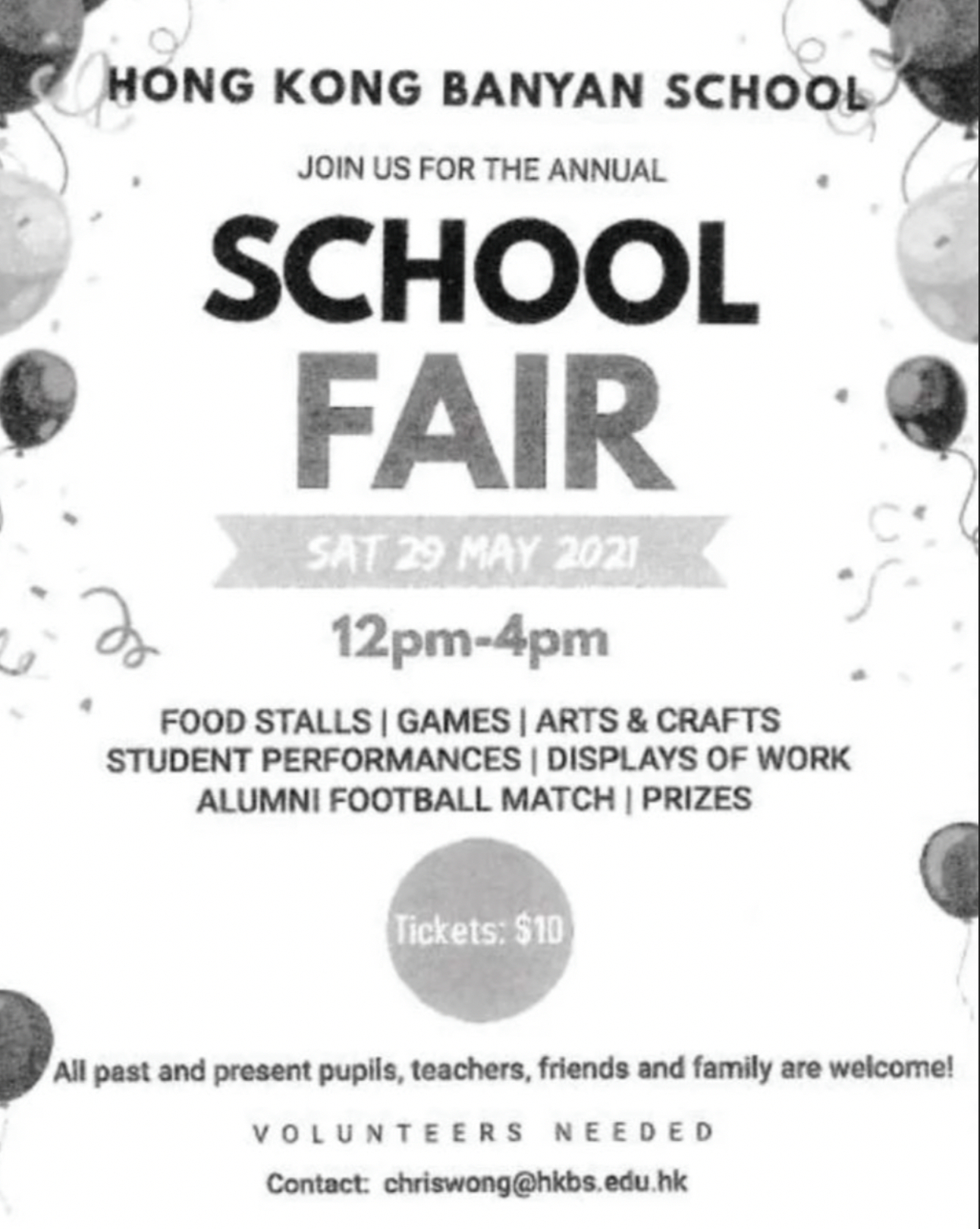 To purchase tickets ($10 per ticket), just log onto the school’s website. If you have any questions, don’t hesitate to contact me at chriswong@hkbs.edu.hk. Volunteers are needed so please be generous with you time.