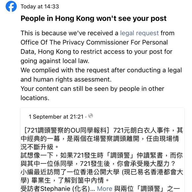 另一方面,《教育刺針》108日發帖指,接獲Facebook通知因接獲香港個人資料私隱專員公署的法律要求,經法律及人權評估考慮後,禁止香港用戶瀏覽《721調頭警身份》帖文,但仍然身處其他地區的用戶可以繼續瀏覽。